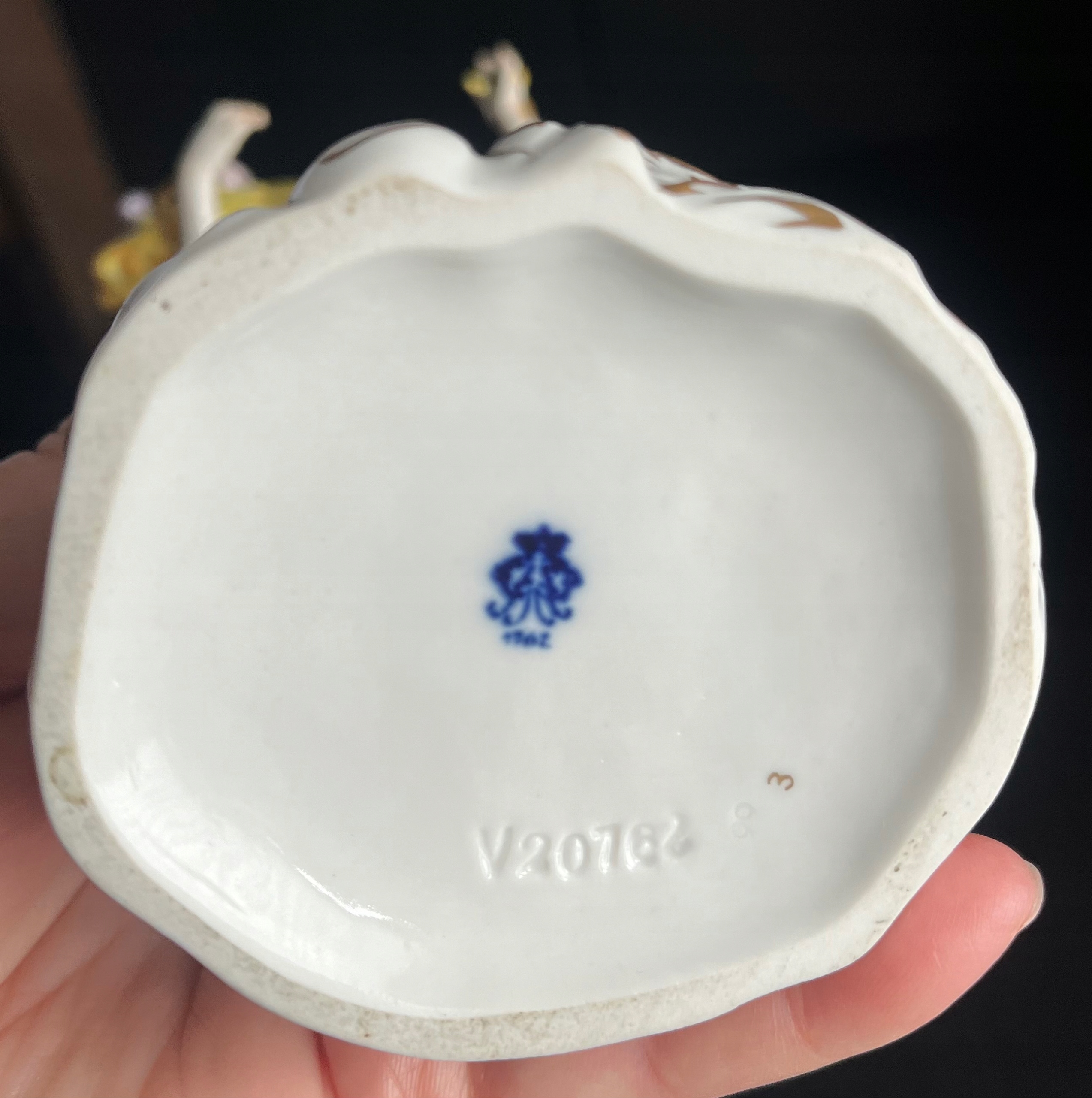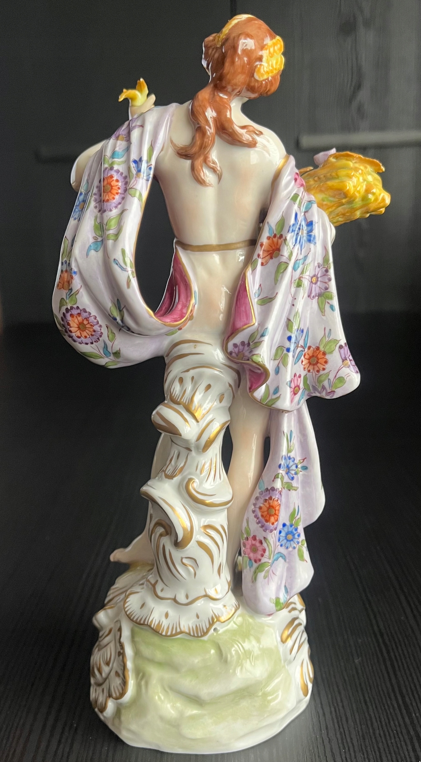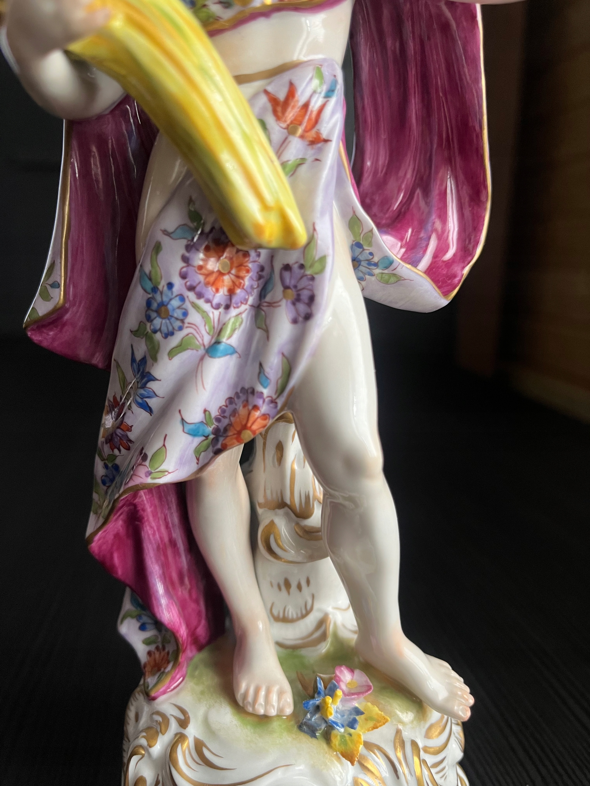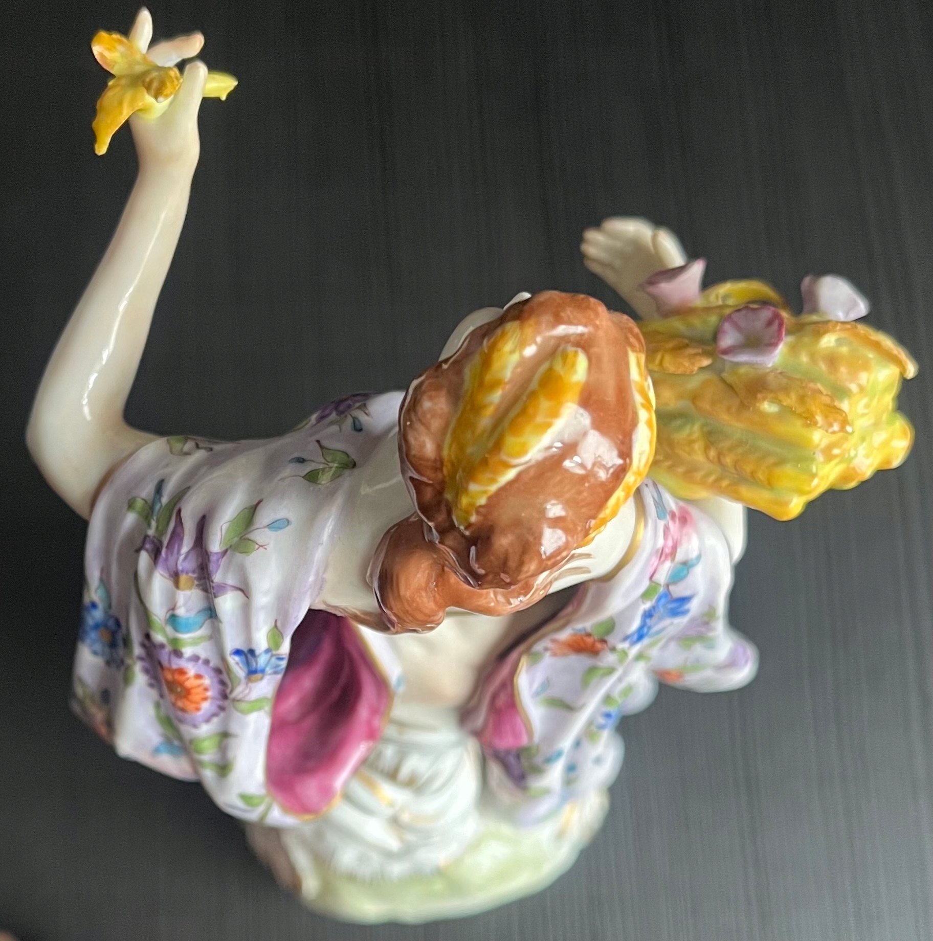 Красива порцелянова статуетка із зображенням жінки з оберемком зерна, з якого визирає рожевий кукіль. Фігурка чудово розписана з великою увагою до деталей, позолота в ідеальному стані! За формою і фасоном нагадує знамениті майсенські статуетки. Розміри на фото. Пальці та нігті цілі, без подряпин, тріщин та інших дефектів. Фігурка виготовлена в 1940-х роках.