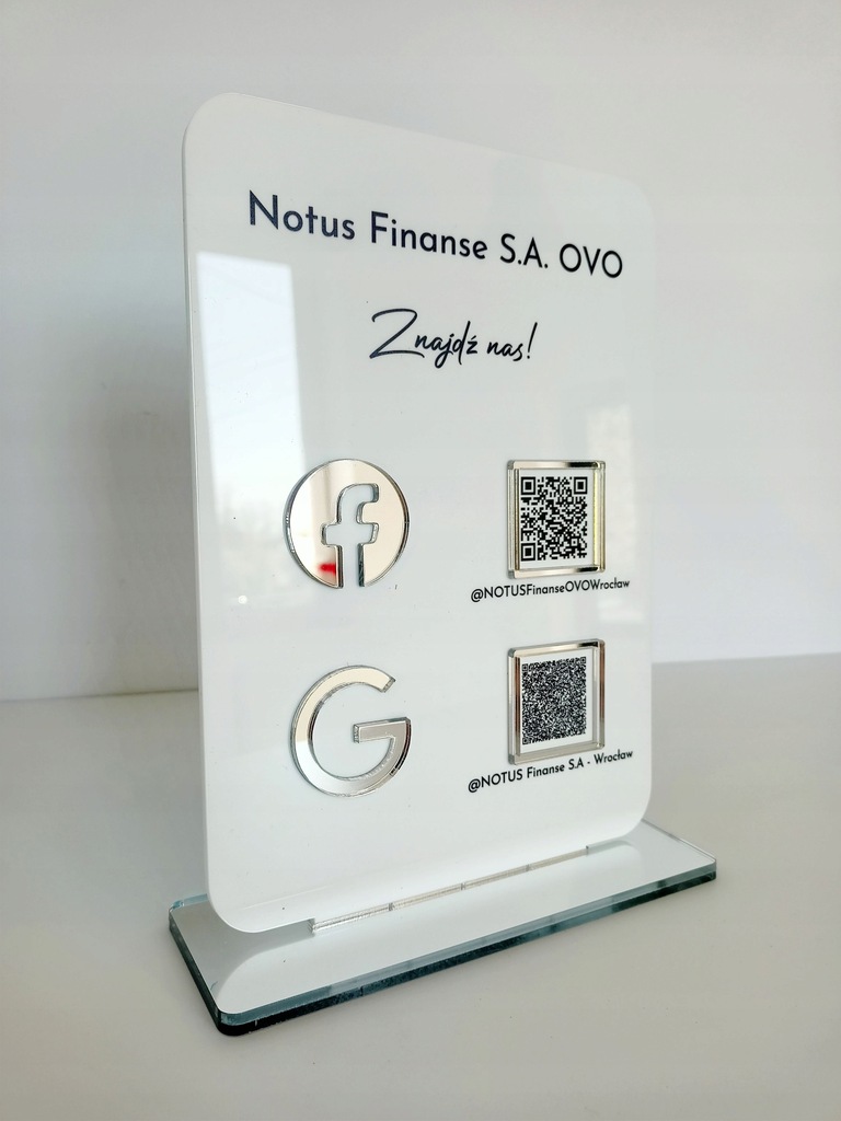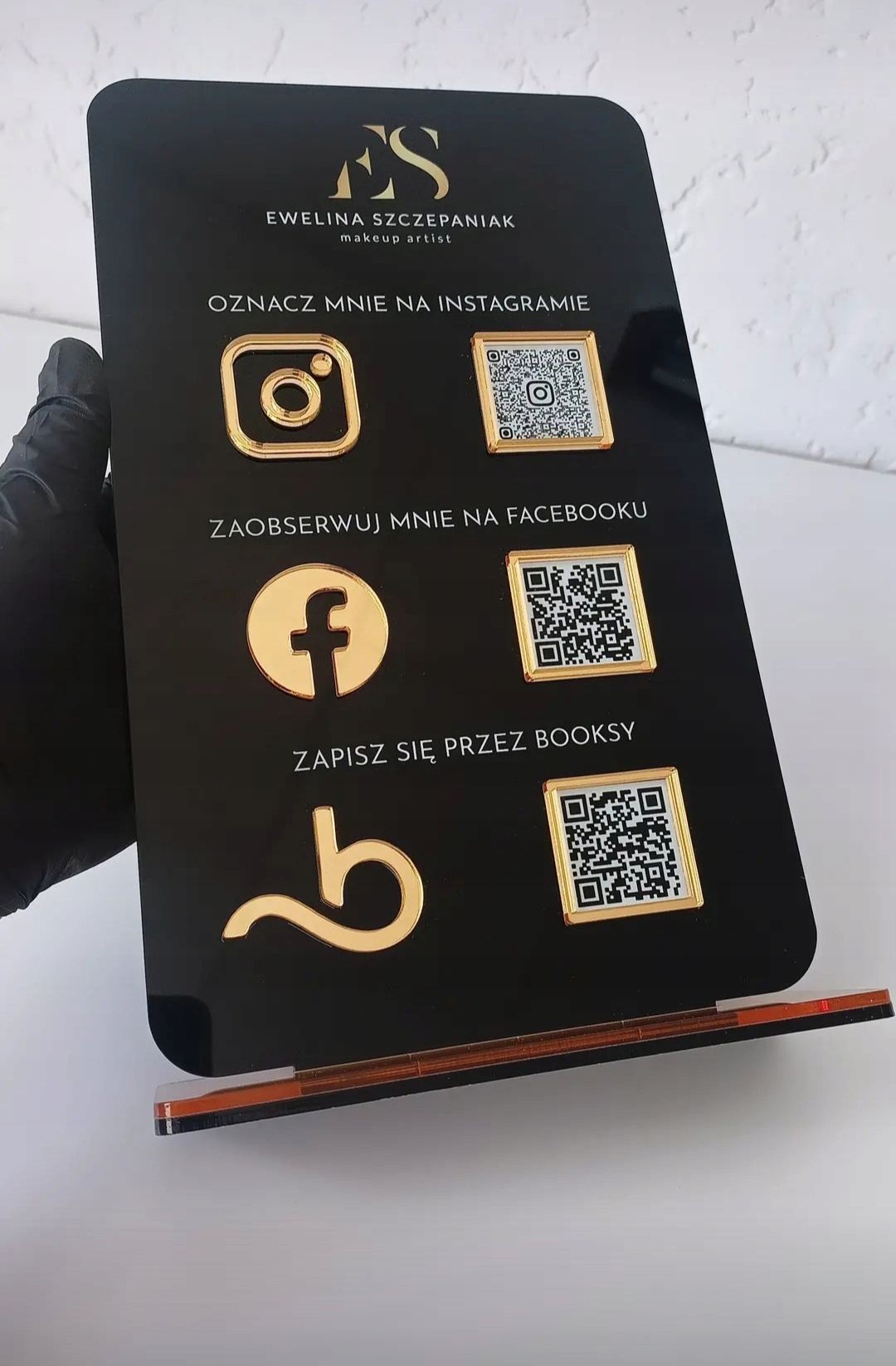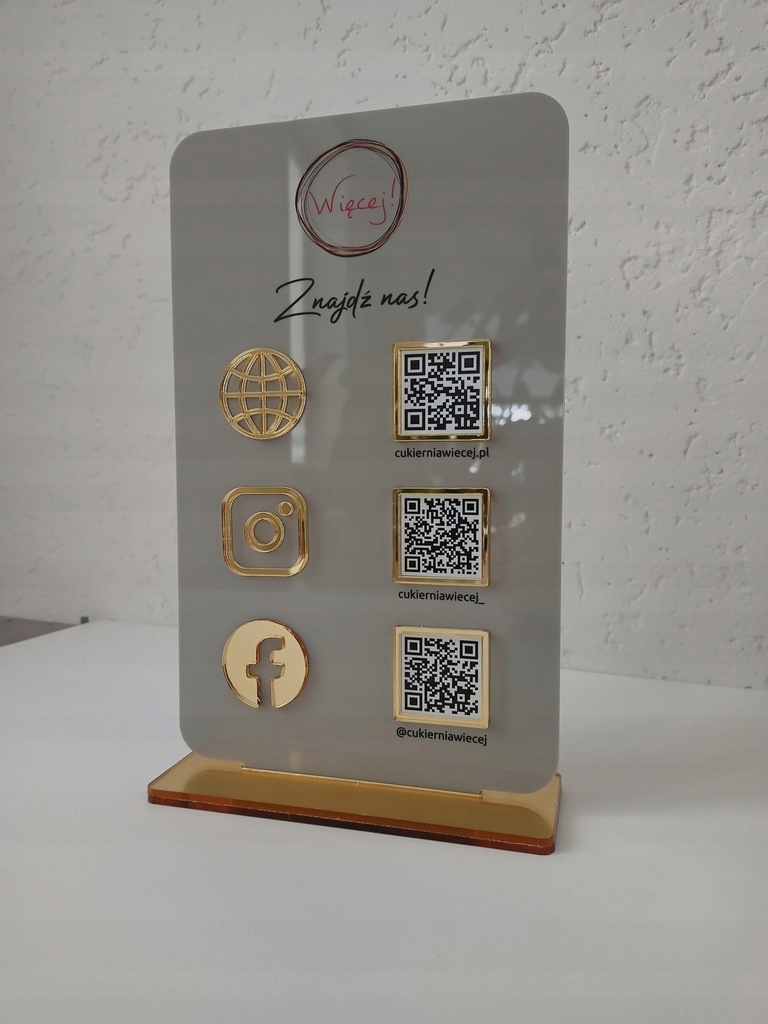 планшет виготовлений з білого акрилу, а дзеркальні елементи золота, сріблястого або рожевого -zloty (Rosegle). Ми друкуємо QR -коди, це не наклейки. Друк довговічний і не відпаде або не буде диким. Ми можемо поставити будь -який текст та QR -код. Розмір становить 23x16 см (2 Kodes) або 26x16 см (3kody)