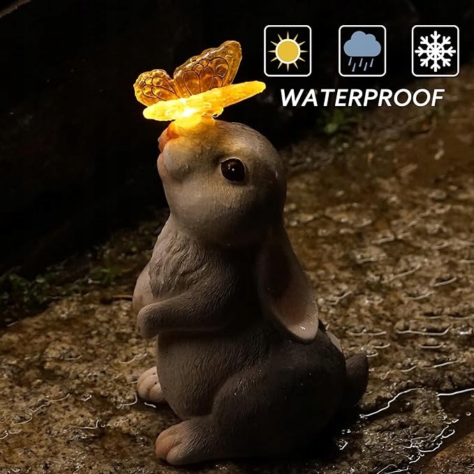 - 🐰Яскравий декор кроликів: зовнішній вигляд у стилі ретро, глибокі очі, довгі вуха, чітка текстура, ці полімерні статуї кроликів виглядають і відчуваються як справжній кролик. Лампа-метелик на сонячних батареях лежить на носику зайчика, як милий зайчик, який грається з метеликом, додаючи більше енергії та кольору вашому дому.