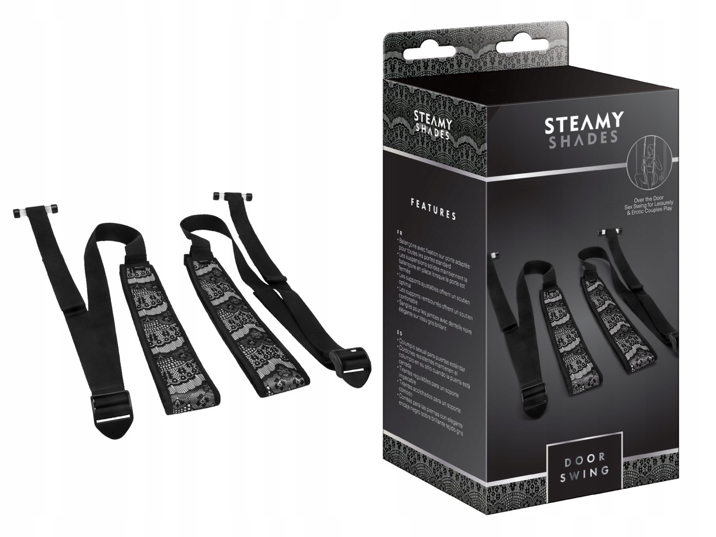 "Дверна гойдалка STEAMY SHADES" Секс-гойдалка надійно висить над будь-якими стандартними дверима, міцні штанги тримають гойдалку на місці над будь-якими закритими дверима , регульовані лямки забезпечують оптимальну підтримку, м’які лямки забезпечують зручну підтримку, лямки для ніг мають елегантну прозору чорну мереживну накладку на блискучу сіру тканину. Гойдалки (100% поліестер) ; смуги (100% поліпропілен); Регулятори (100% ABS пластик); Гачки (100% акрил)