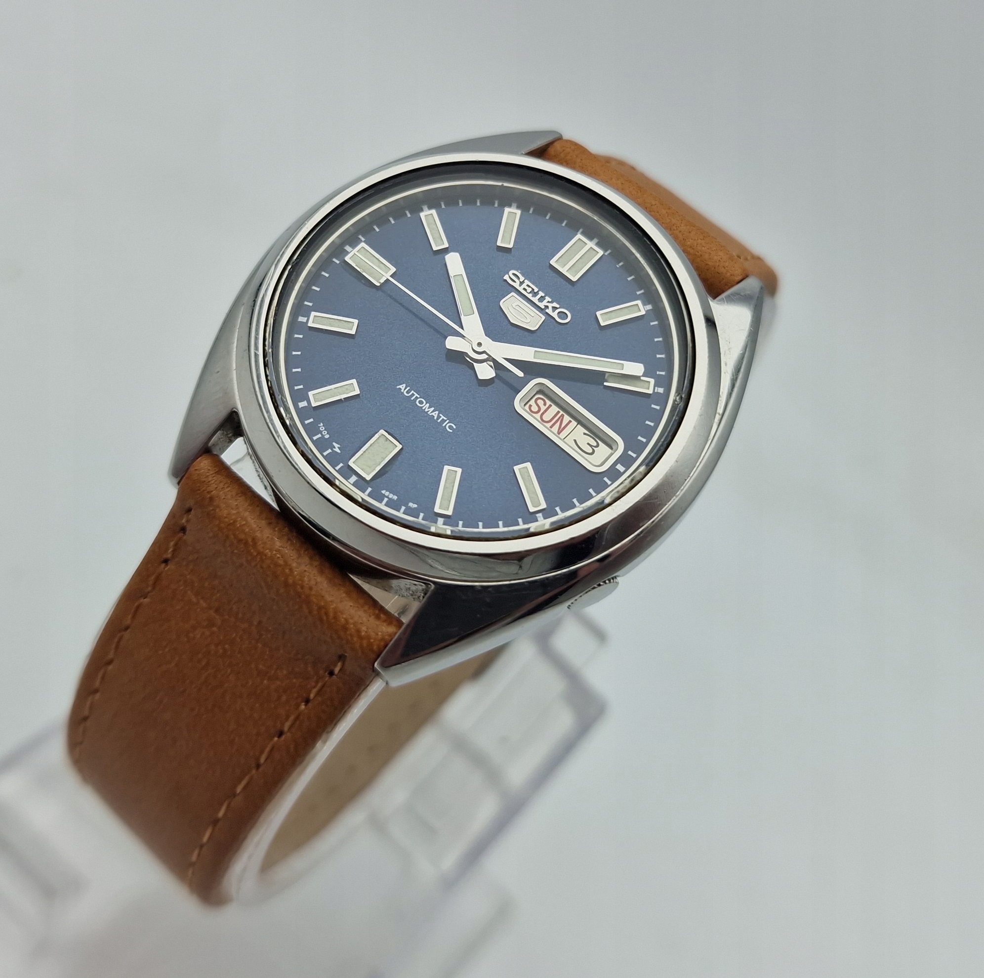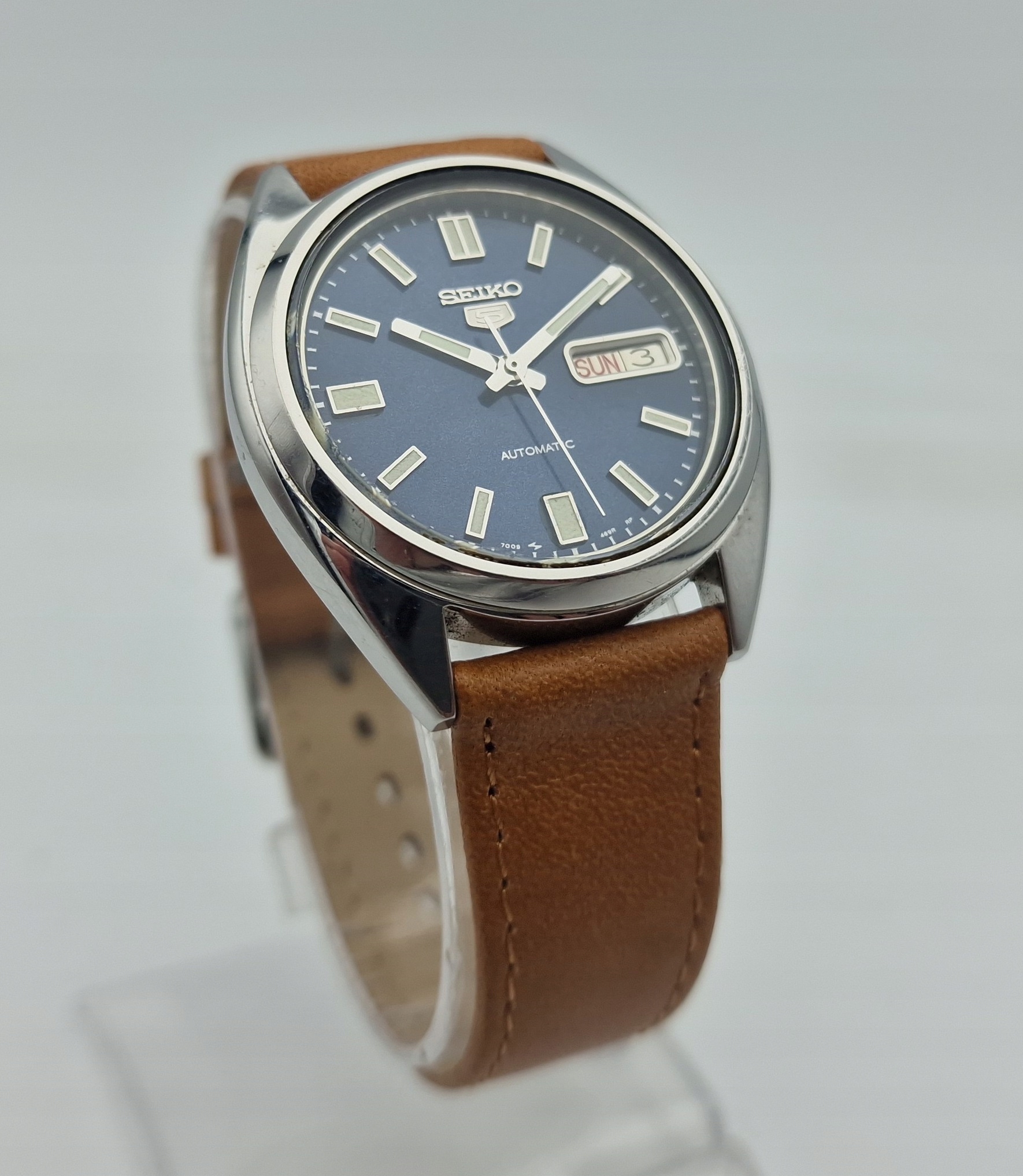 - темно-синій металевий диск із знайомими о третій годині. Підписаний диск: " Seiko 5, Automatic, Japan ". Щит у ідеальному стані, який представлений фотографіями аукціону.