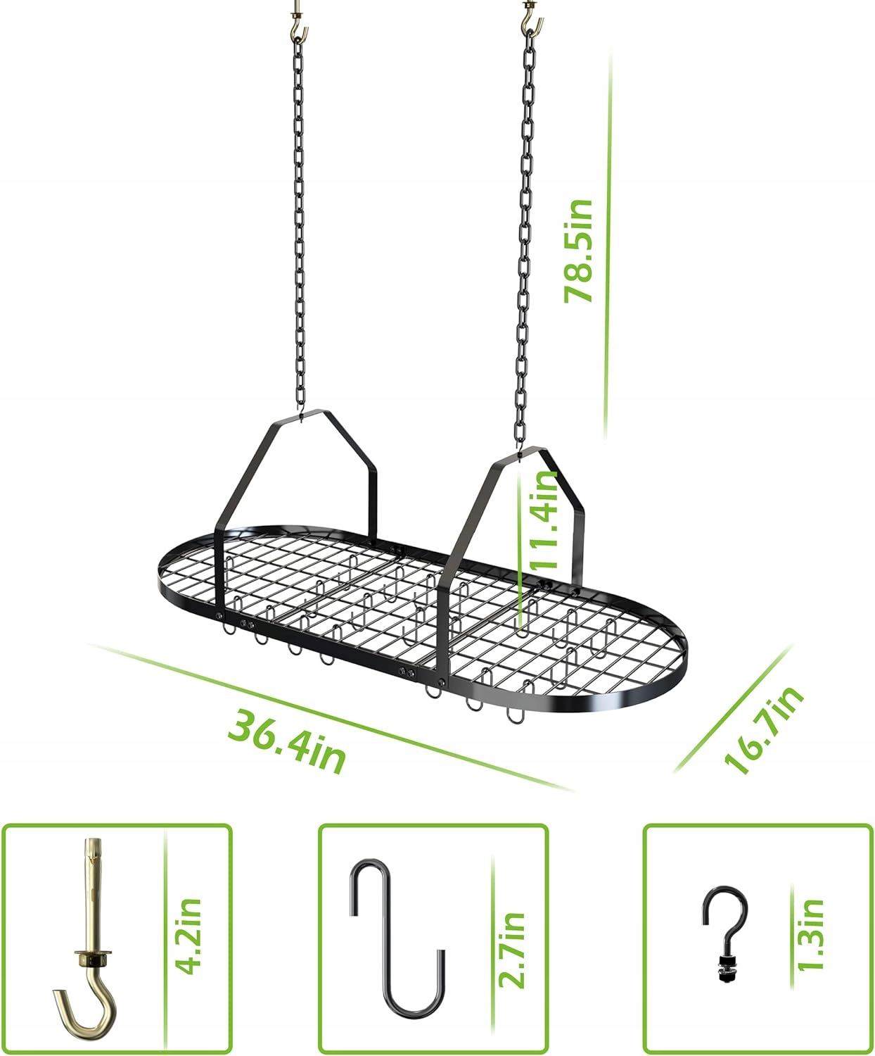 Найвища якість Цей тримач для каструль виготовлено з товстого металу з міцним порошковим покриттям, яке робить виріб водонепроникним і стійким до корозії. По-друге, виріб виготовлено з достатньої кількості матеріалів, щоб витримати підставку для горщика вантажопідйомністю 50 кг. Велика місткість Розміри 93 x 42 см x 29 см і оснащена 20 знімними гачками. Ви не тільки можете зберігати достатньо предметів на полиці та використовувати гачки, щоб повісити кухонне начиння. Таким чином зменшується безлад у кімнаті. Стельова стійка для горщиків, що заощаджує місце, може зберігати, упорядковувати та демонструвати різноманітне кухонне начиння в компактному просторі, вона ідеально підходить для місць, де обмежений простір для зберігання. Тому використання стельової підставки під горщик може заощадити більше місця. Легке встановлення Ми надамо докладні інструкції зі встановлення стельового кріплення. Ви можете легко встановити цей продукт. Примітка: Щоб зробити отвори, необхідно підготувати електродриль. Багатофункціональний стельовий стелаж підходить для зберігання в різних ситуаціях. Його можна використовувати для щоденного зберігання кухонного начиння на кухні, в коморі та їдальні.