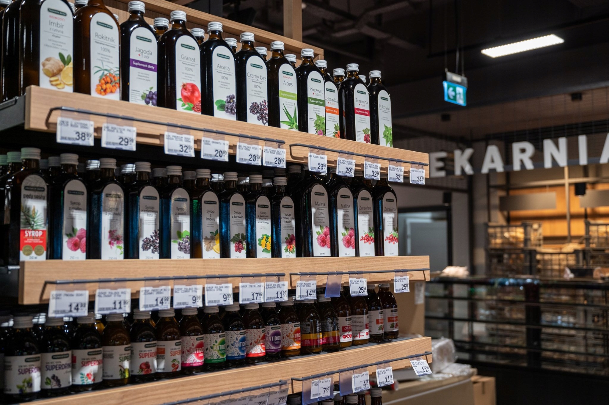 Полиця виконана в елегантному світло-сірому кольорі, що надає їй сучасного вигляду. Він ідеально поєднує функціональність з естетикою, підкреслюючи стиль інтер'єру кожного магазину.