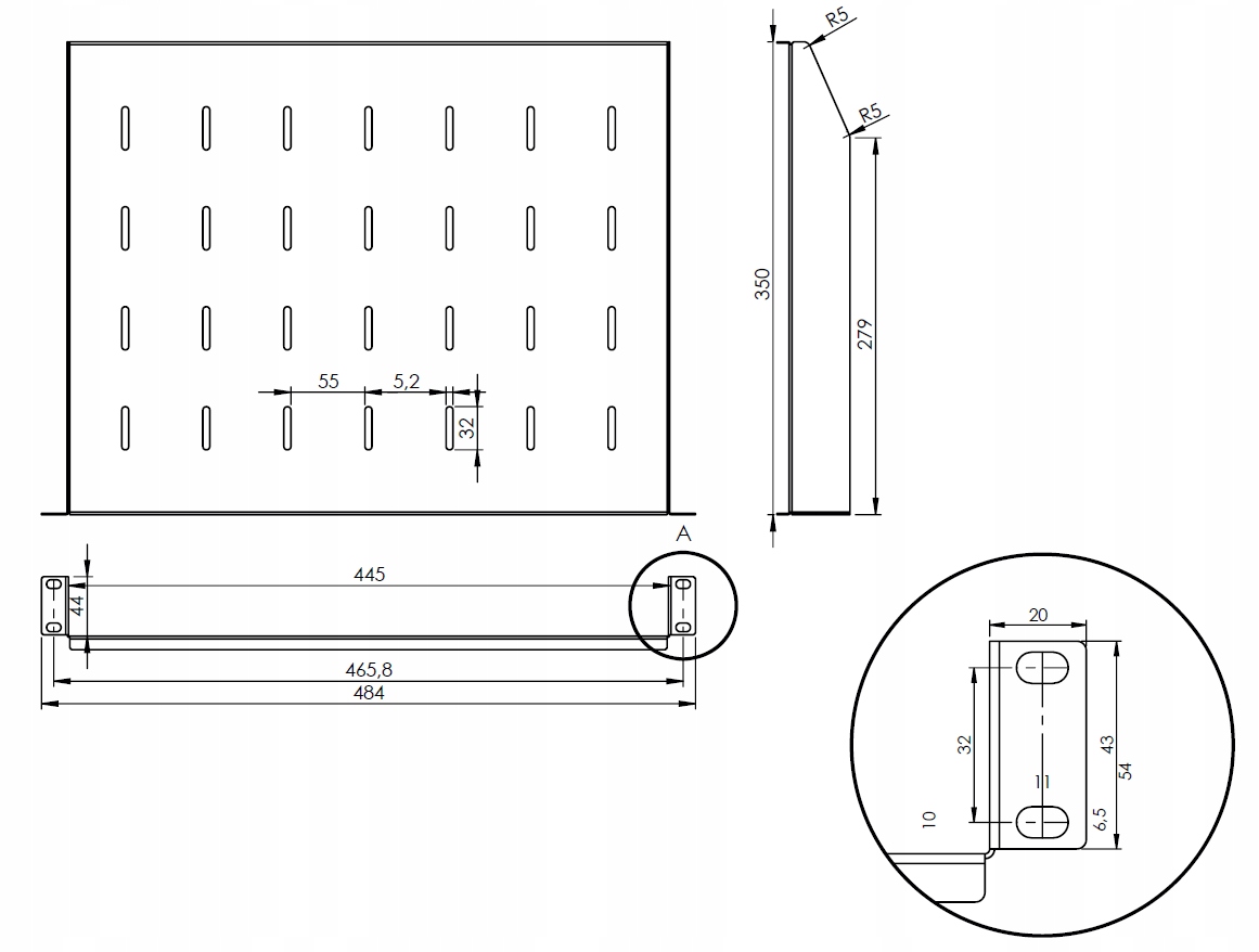 У нижній частині полиці є отвори, які можна використовувати для додаткового закріплення пристроїв за допомогою кабельних стяжок і не блокують потік повітря.