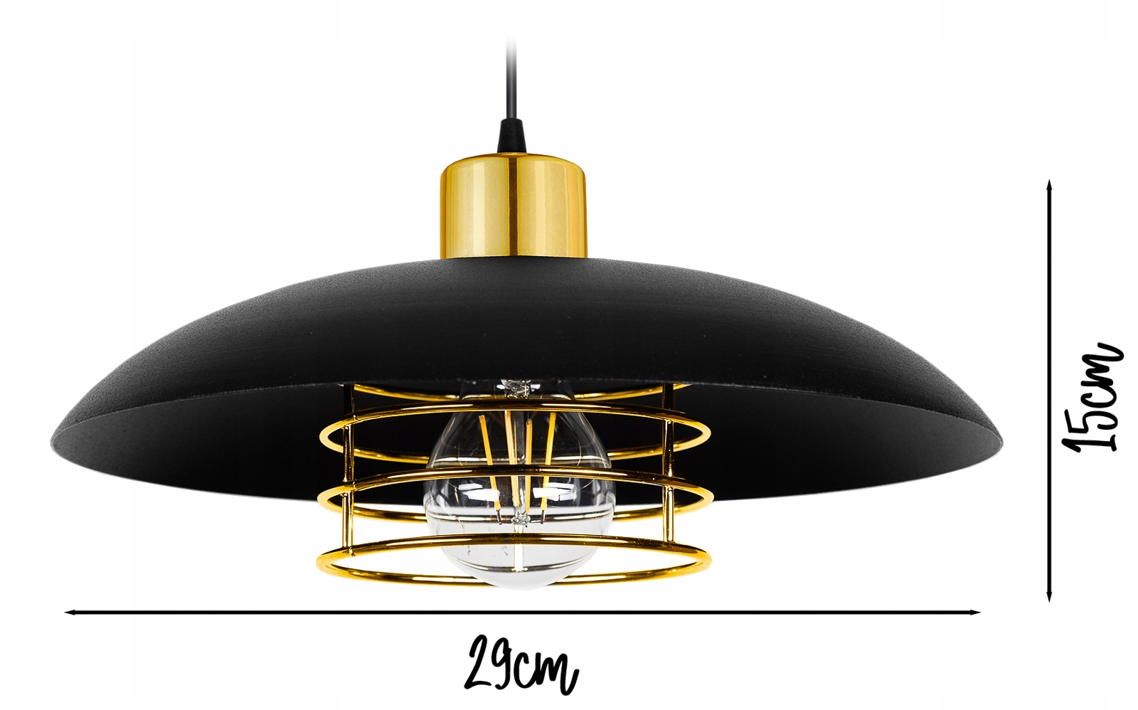 Предметом пропозиції є сучасний і дизайнерський підвісний стельовий світильник з металевим плафоном і золотою фурнітурою.