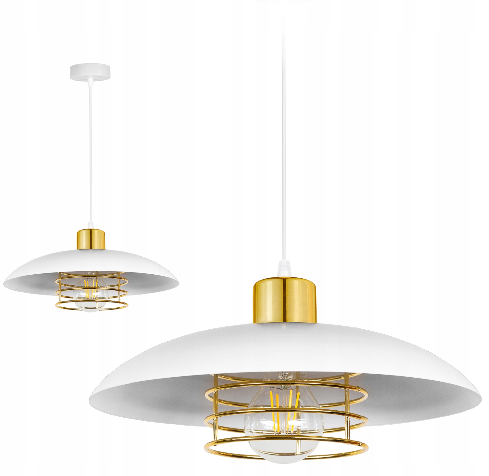 Предметом пропозиції є сучасний і дизайнерський підвісний стельовий світильник з металевим плафоном і золотою фурнітурою.
