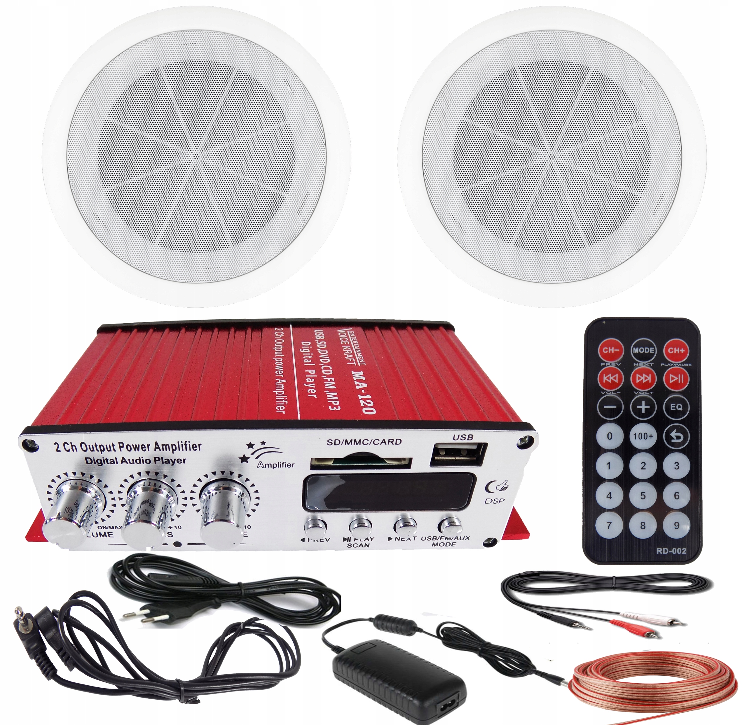 Цей набір ідеально підходить для аудіоустановок у будинках, вітальнях, кімнатах очікування, ванних кімнатах тощо. Підсилювач має вбудоване FM-радіо з телескопічною антеною, USB-портом і пристроєм для читання SD-карт. Ми керуємо всім за допомогою пульта.