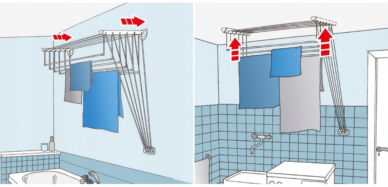 Чудове рішення для тих, хто має підвісну стелю і не може встановити типову стельову сушарку. Сушарка Lift призначена для монтажу на стіні або стелі. Струни вже нарізані, і кріплення може бути з лівого чи правого боку.