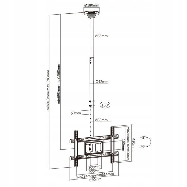 Універсальне стельове кріплення використовується для кріплення OLED / QLED / LED / PLASMA / LCD плазмових телевізорів і моніторів різних марок вагою до 50 кг і діагоналлю екрана від 23" до 100".