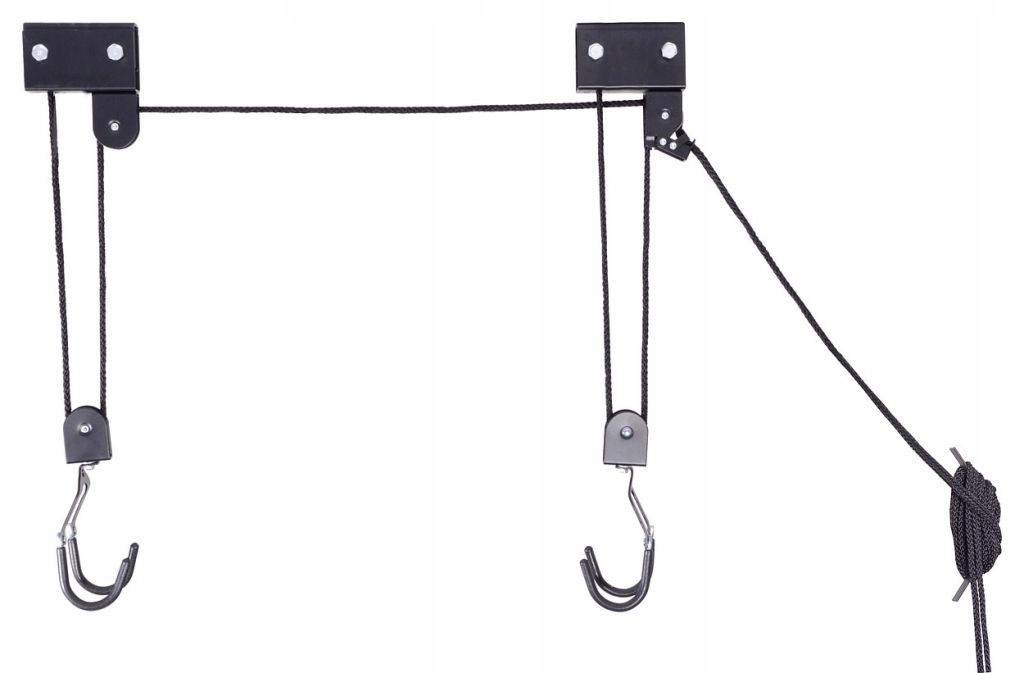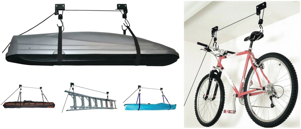 Кріплення працює як підйомник і може легко піднімати багажники, драбини, лижі, велосипеди, каяки та інші подібні великі предмети вагою до 52 кг і розміщуйте їх під стелею кімнати з максимальною висотою 4 м. Гвинти та дюбелі. За допомогою мотузки можна легко маніпулювати підвішеним предметом. Пристрій оснащений гальмом, який запобігає зісковзування троса і запобігає падінню підвішеного предмета. У набір також входить ремінь для безпечного кріплення предметів різних типів і форм.