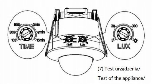 Примітка: під час тестування пристрою вдень ручку LUX потрібно повернути в положення (SUN), інакше датчик не працює правильно!