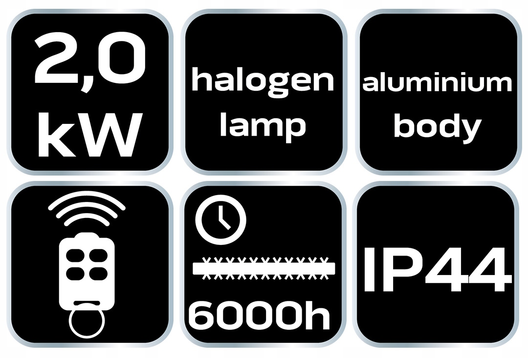 Стельовий радіальний обігрівач 2000 Вт, алюміній, з дистанційним керуванням, вимикачем, нагрівальним елементом з галогенною лампою