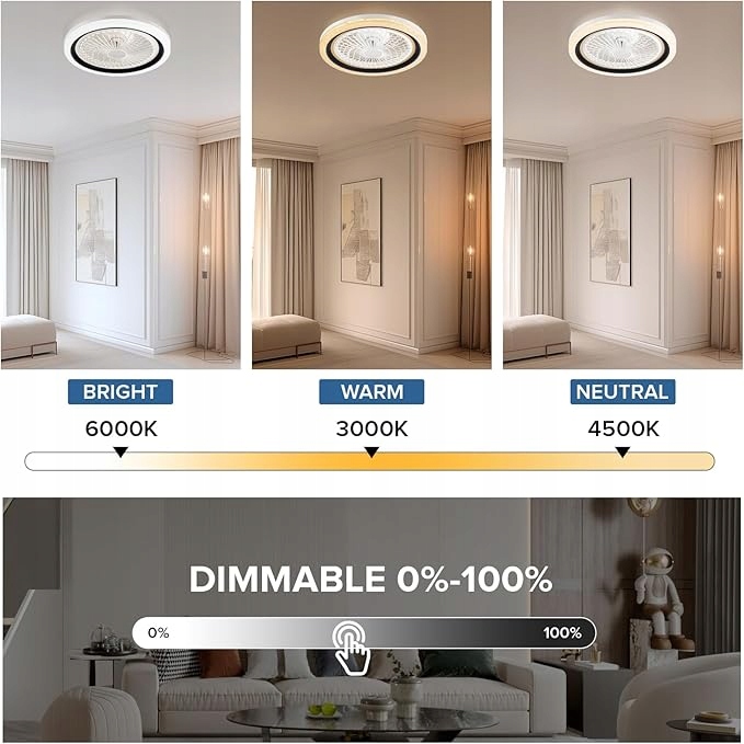 - Регульоване керування: за допомогою цього стельового вентилятора ви можете індивідуально регулювати освітлення та потік повітря. Завдяки трьом змінним колірним температурам і регульованій яскравості ви можете створити ідеальну атмосферу, а шість швидкостей вітру адаптуються до ваших уподобань повітряного потоку.