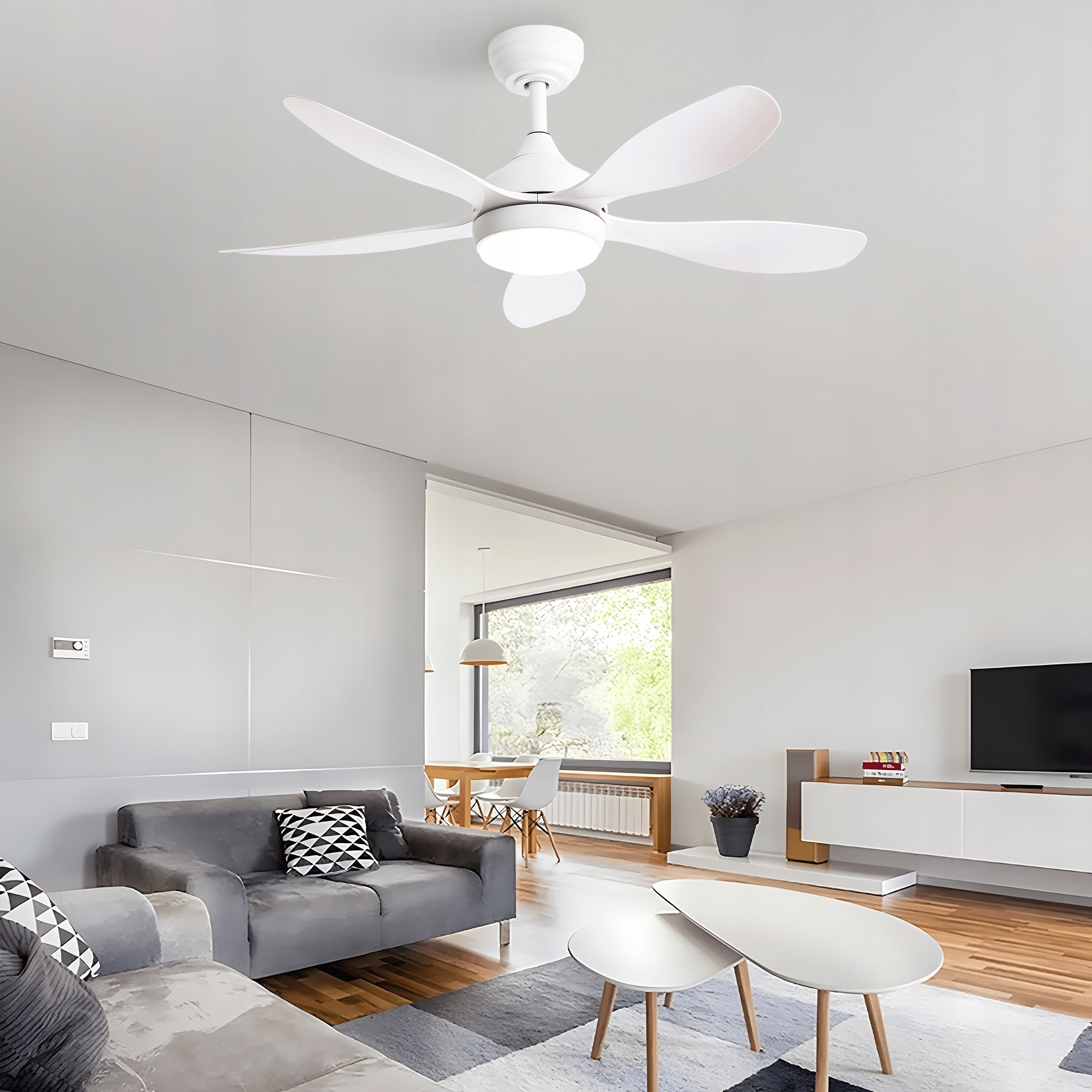 , оснащений оборотним двигуном постійного струму, цей стельовий вентилятор поєднує в собі спокійну роботу та високу енергоефективність. Завдяки функції обертання вперед та назад, вона забезпечує приємне охолодження влітку, а взимку підтримує рівномірне розподіл теплого повітря. Два режими потоку повітря дозволяють налаштувати вентилятор до ваших потреб, гарантуючи комфорт протягом року.
