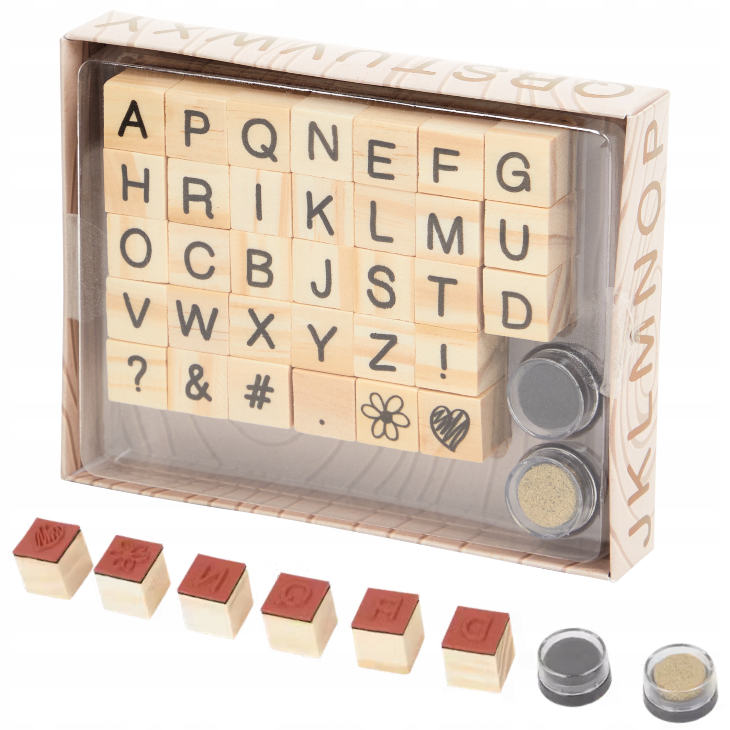 НАБІР ШТАМПІВ АЛФАВІТУ ДЕРЕВ’ЯНІ ЛІТЕРИ 40 ШТ. МЕГА НАБІР ЧОРНИЛ