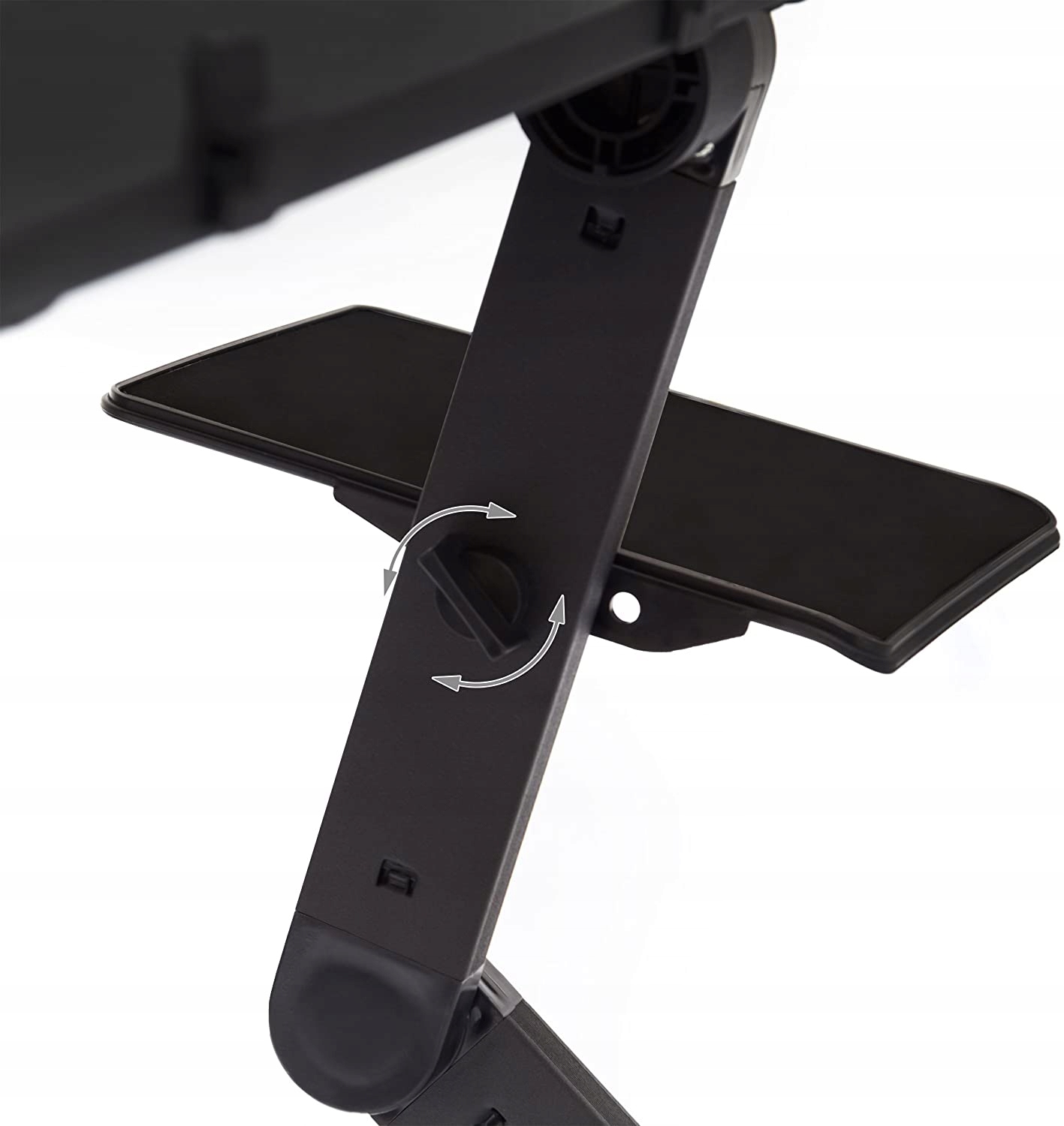 Висота поблажливо регулюється і дозволяє працювати в приємному та ергономічному сидячому положенні. Крім того, робоча поверхня індивідуально регулюється. Шляхальний секундомір запобігає ковзанню ноутбука і забезпечує безпечне утримання також з косим схилом. Вентилятор під робочою поверхнею захищає ноутбук від перегріву.