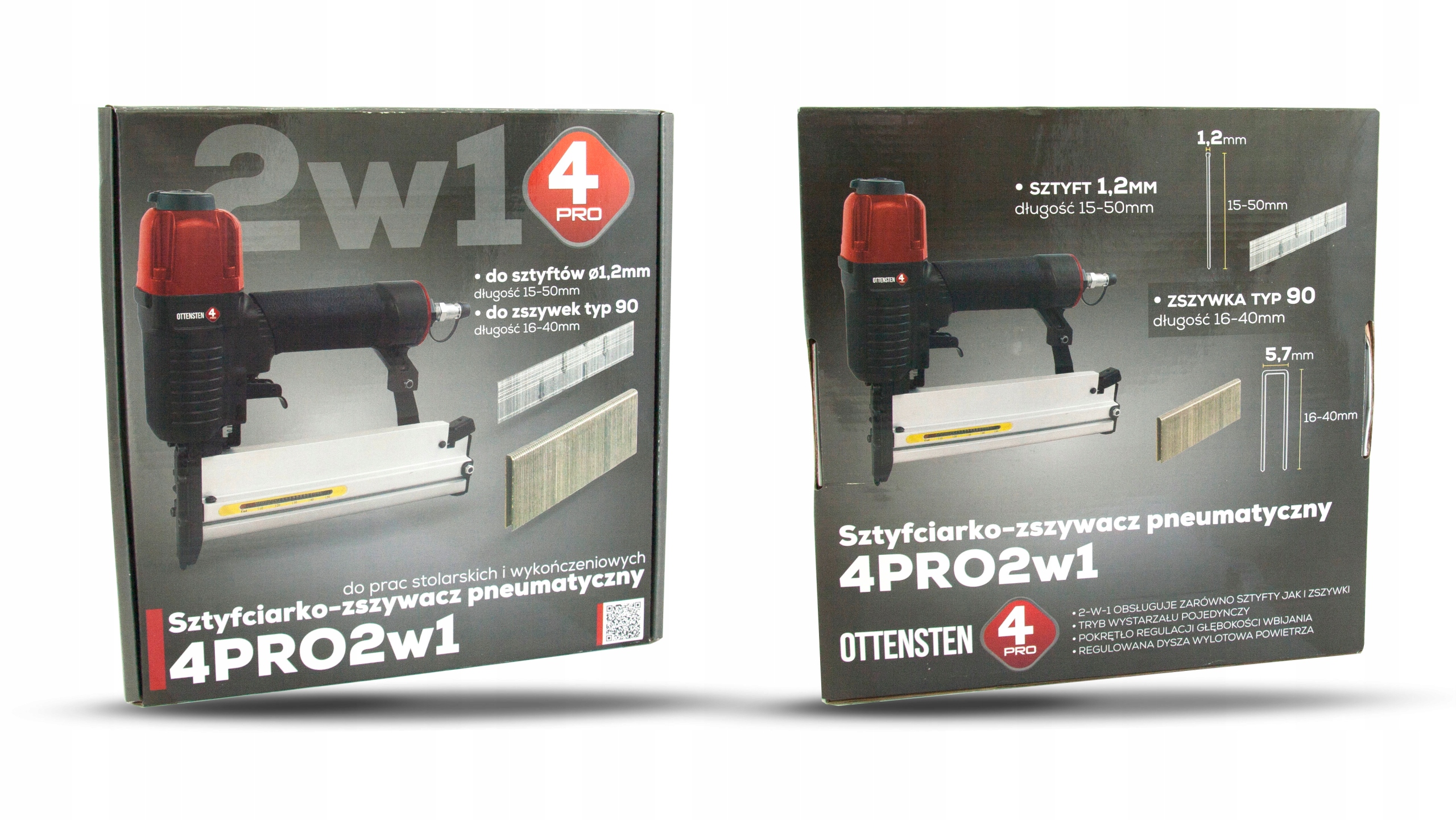 Пневматичний степлер 2в1 4PRO рекомендований як для професіоналів, що займаються фінішною обробкою, так і для всіх, хто виконує дрібні столярні та будівельні роботи. Ідеальний інструмент для домашньої майстерні - два пневматичних інструменти для професійного використання в одній недорогій ціні.
