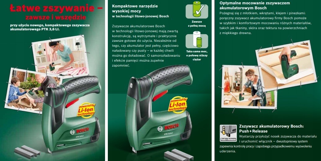 Зручний акумуляторний степлер PTK 3.6 LI від Bosch простий у використанні. Завдяки використанню літій-іонної технології не має ефекту пам'яті і не саморозряджається. Система Push+Release забезпечує контрольований випуск пострілу, таким чином гарантуючи безпечну роботу. Чіткі індикатори стану батареї та запасу скріплюючого матеріалу полегшують орієнтацію під час декоративно-монтажних робіт. Надзвичайно практичне рішення: завдяки ергономічній ручці Softgrip степлер PTK 3.6 LI зручно лежить у вашій руці навіть після тривалої роботи.