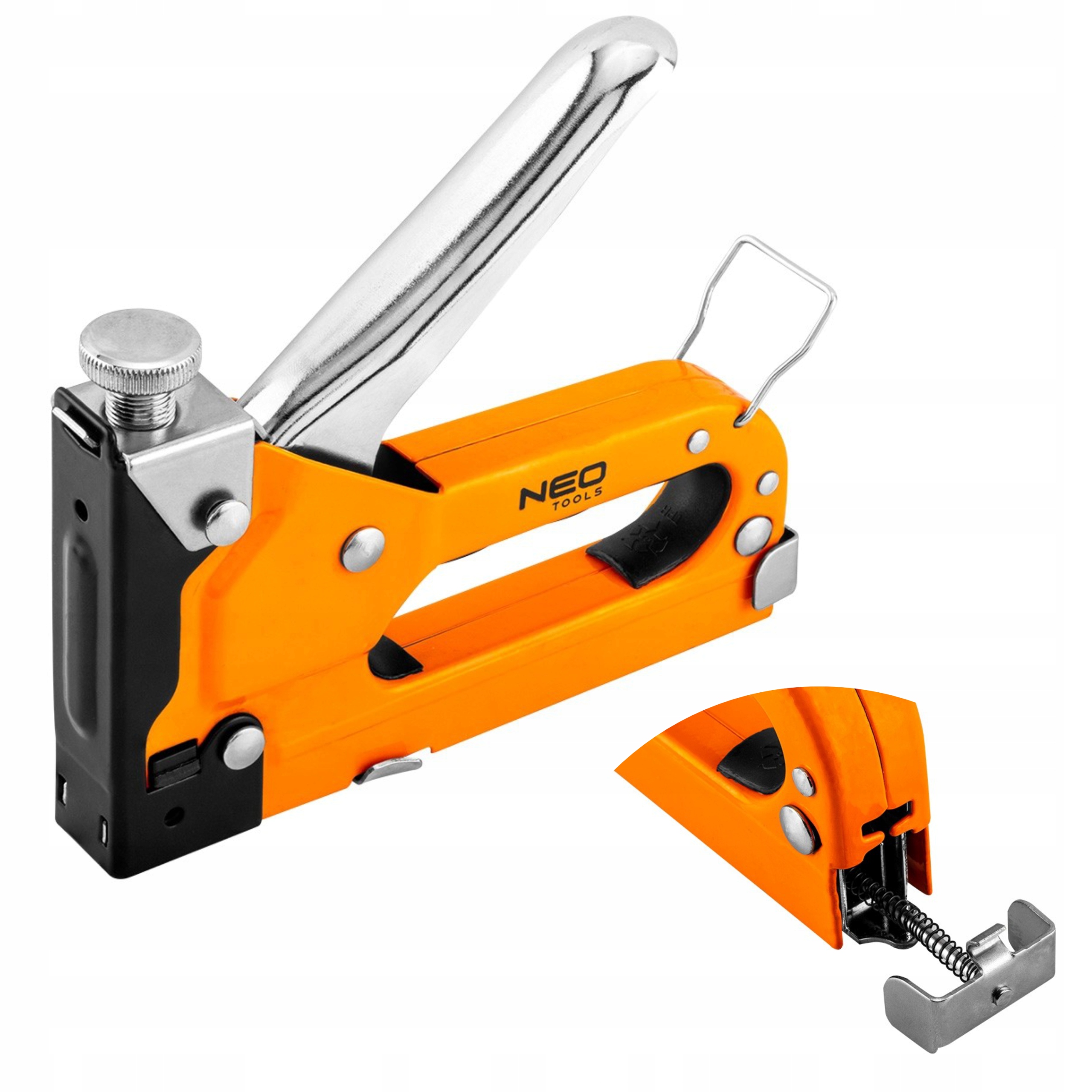 Степлер для оббивки NEO дозволяє використовувати скоби J-типу різної довжини залежно від ваших потреб. Дозволяє використовувати скоби від 4 до 14 мм. Пристрій простий і зручний у використанні, а ручка має відповідний профіль для максимального комфорту роботи. Не вимагає застосування сили при з’єднанні матеріалів.