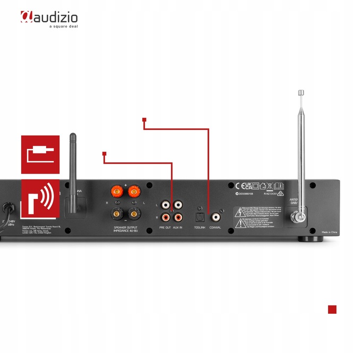 Якщо такі пристрої часто потрібно підключати до стереосистеми, це не стосується Brescia. Brescia оснащений вбудованим підсилювачем, тому ви можете підключати колонки безпосередньо до нього. Підсилювач є стереопідсилювачем класу D потужністю 120 Вт (2x 60 Вт). З Brescia у вас є компактна звукова система з багатьма можливостями, яку можна використовувати для багатьох застосувань.