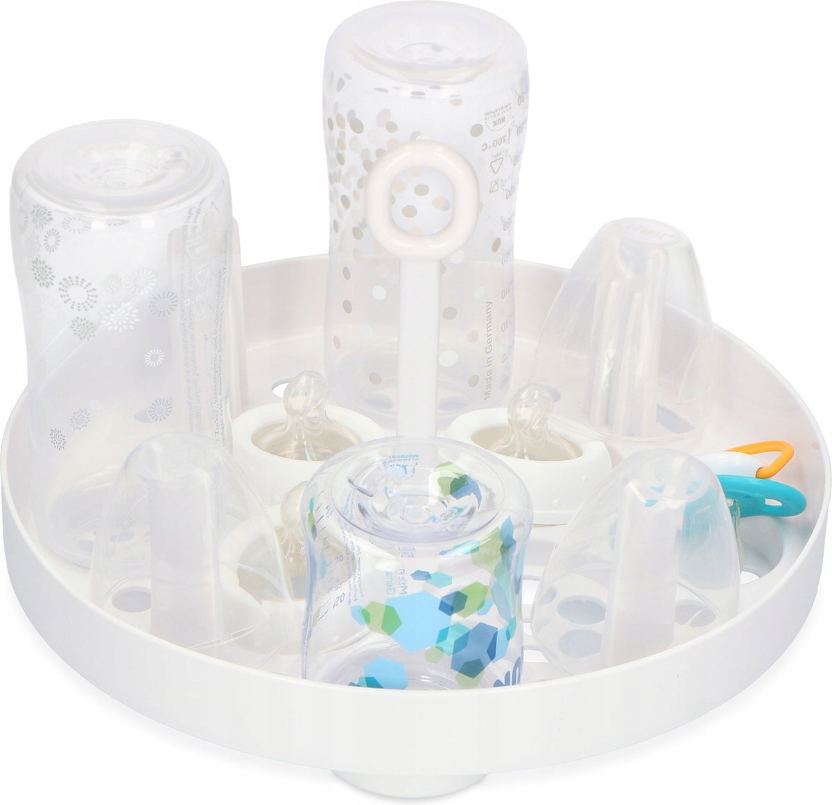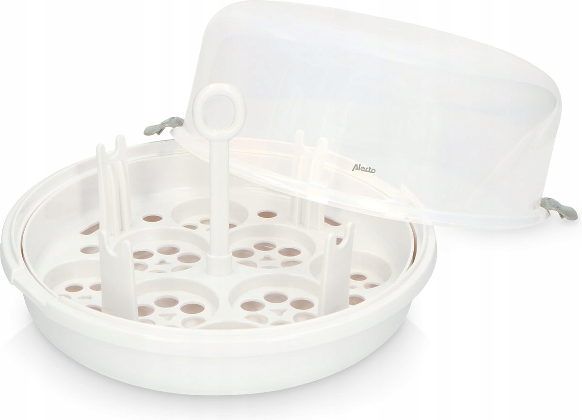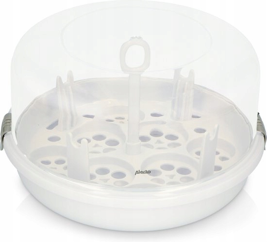 Стерилізатор для пляшечок — це міцний, легкий контейнер із кришкою. Ви промиваєте пляшечки та соски та кладете їх догори дном у миску. Налийте приблизно 120 мл звичайної водопровідної води на дно ємності. Закрити ємність кришкою і поставити в мікрохвильову піч. Увімкніть мікрохвильову піч на шість хвилин на найвищому рівні, і все готово. Пляшки тепер незаймані і можуть зберігатися стерильними протягом 24 годин, поки кришка контейнера залишається закритою. Стерилізатор для пляшок вміщує одночасно чотири пляшки об’ємом 250 мл і підходить для будь-якої стандартної мікрохвильової печі.