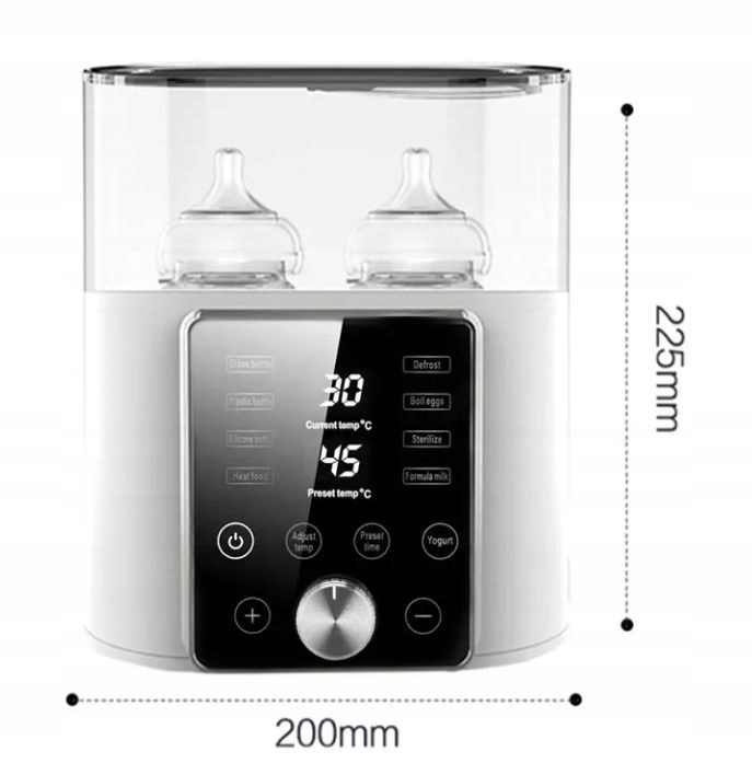 1. Багатофункціональний 9 в 1, тепле молоко 45 ℃, відтавання 55 ℃, тепла формула 75 ℃, стерилізація 100 ℃. Висока ємність, тримає 2 пляшки. Інтелектуальний сенсорний екран, легка робота. Захист від подрібнення. Зовнішній датчик ретельної температури. 100 ℃