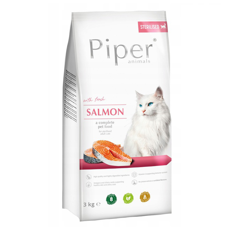 Сухий корм PIPER ANIMALS STERILIZED з лососем, завдяки вмісту м'яса і продуктів тваринного походження, в тому числі свіжого лосося, покриває потребу дорослого стерилізованого кота в речовинах, необхідних для щоденного харчування. Одним із них є, серед інших, таурин, який має антиоксидантні властивості, тобто затримує старіння. Масло лосося є цінним джерелом поліненасичених жирних кислот із сімейства n-3, які покращують зовнішній вигляд шкіри та шерсті та регулюють роботу серцево-судинної системи. Додавання екстракту юки Мохаве, завдяки наявності харчових волокон, стимулює виділення травних соків, що покращує обмін речовин. До складу корму входять поживні речовини, необхідні для підтримки здоров'я і хорошого стану дорослого стерилізованого кота, і при дотриманні рекомендованих кількостей, які дають кішці, це не сприяє розвитку надмірної ваги та ожиріння.