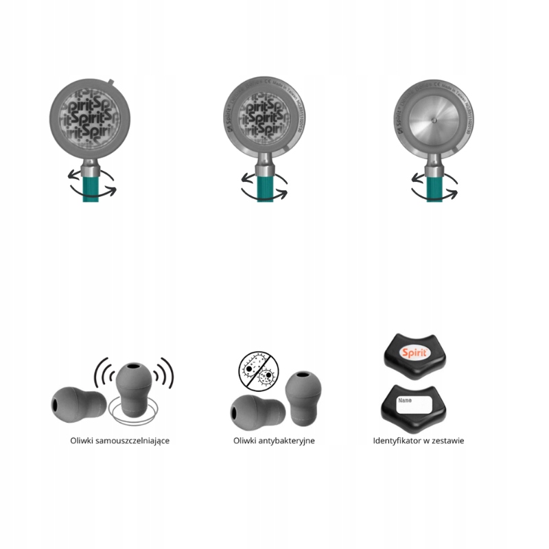 Стетоскоп Spiritхарактеризується високою якістю виготовлення з увагою до найдрібніших деталей та унікальним дизайном. Він має вдосконалену вбудовану двосторонню головку з нержавіючої сталі, оснащену великою діафрагмою для дорослих і маленькою для дітей. Завдяки використанню інтегрованої мембрани з обідком педіатричну мембрану можна легко та швидко трансформувати у воронку. Для полегшення заміни педіатричної діафрагми на лійку є маленька ручка на ободі та комірці лійки.