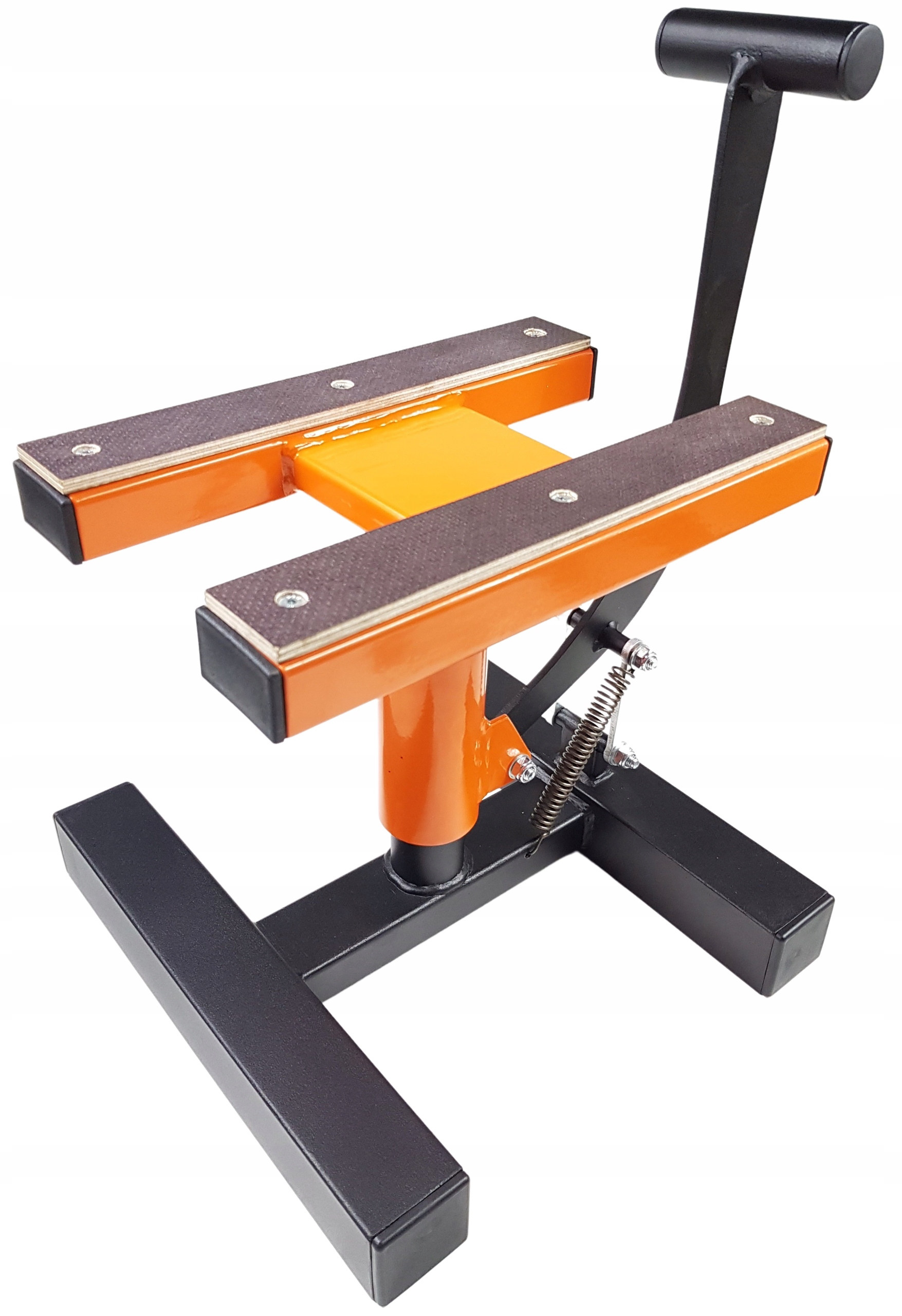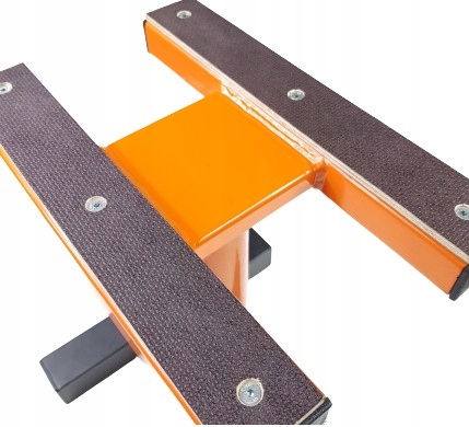 Ергономічний кронштейн гарантує, що ви можете поставити мотоцикл на підставку лише однією рукою з невеликим зусиллям. Протиковзкі пластини, прикручені до верхньої частини підставки, запобігають зісковзуванню транспортного засобу з підйомника, на відміну від підйомників з гумовим покриттям, ми впевнені, що водонепроникний шар пластини не розчиниться під впливом масла чи бензину - тому що такі трапляються ситуації і при обслуговуванні машини :)