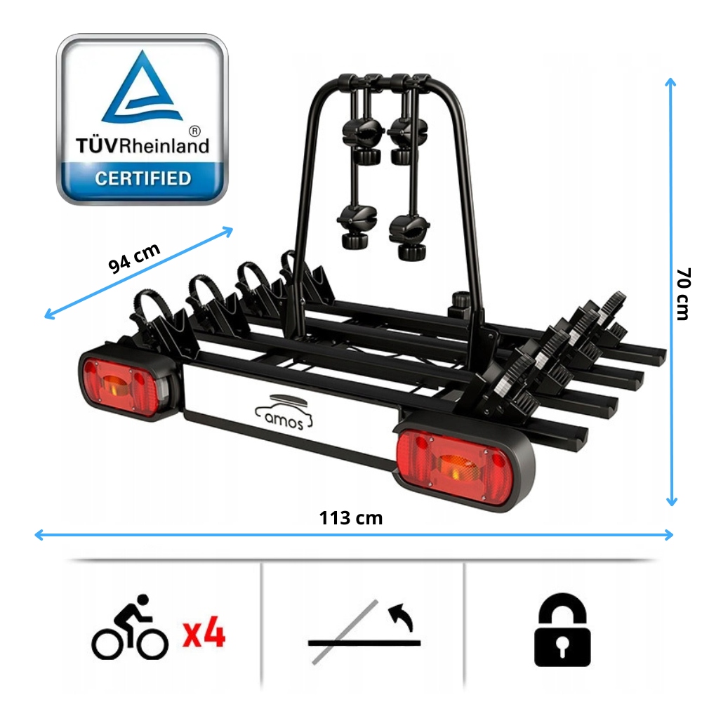 Той факт, що продукти Amos мають сертифікат TÜV, є гарантією безпечного використання продукції цього бренду. Вибираючи платформу Amos, ви можете бути впевнені, що ви та ваші велосипеди в безпеці протягом усієї подорожі.