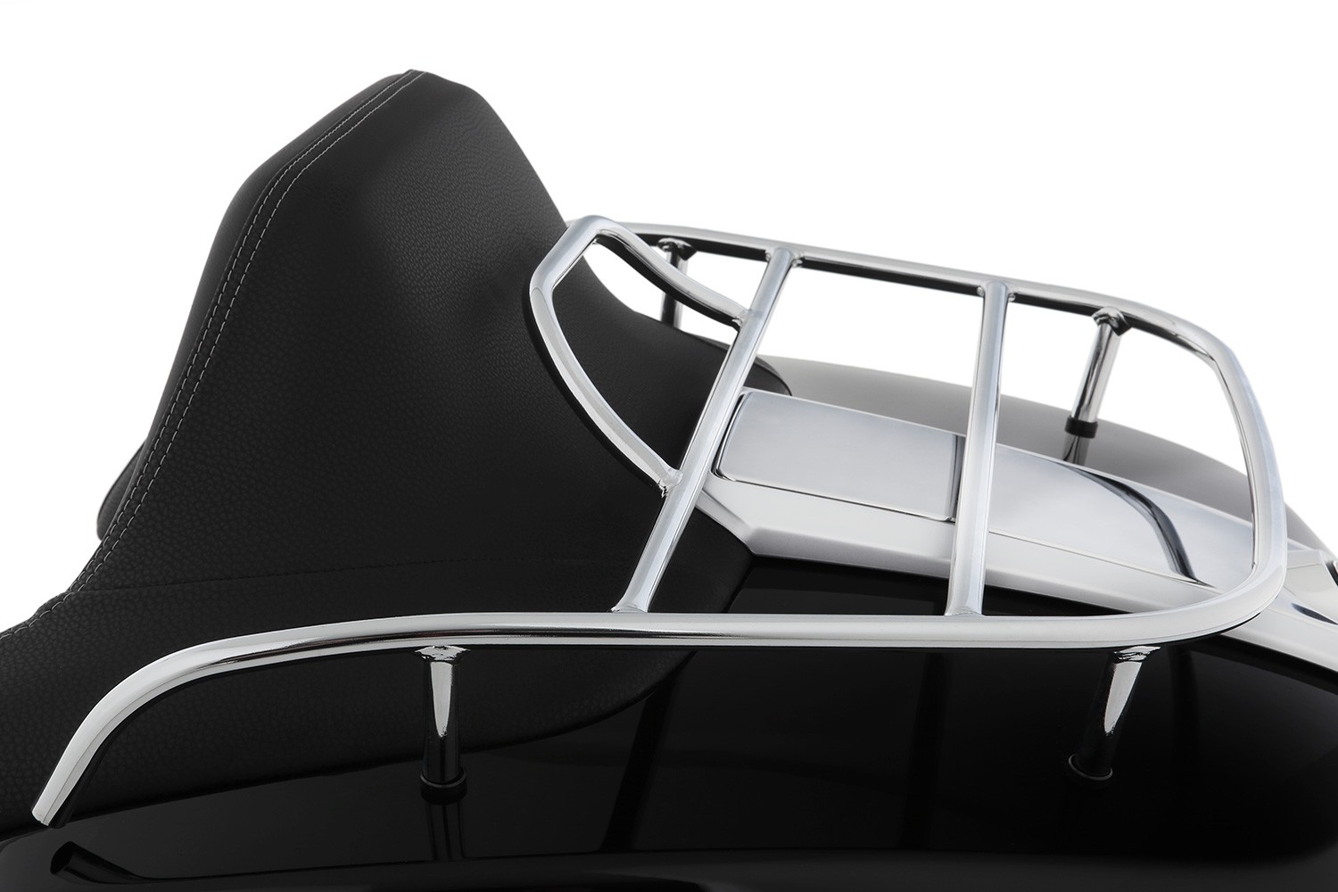 Стійка Wunderlich для верхнього корпусу R18 Transcontinental, елегантна та функціональна. Таким чином, він створює стилістичний акцент, залишаючись безперечно функціональним: він може вмістити додатковий багаж або будь-що, що потрібно швидко мати під рукою в дорозі, або що не повинно бути у верхній коробці, наприклад, костюм від мокрого дощу.