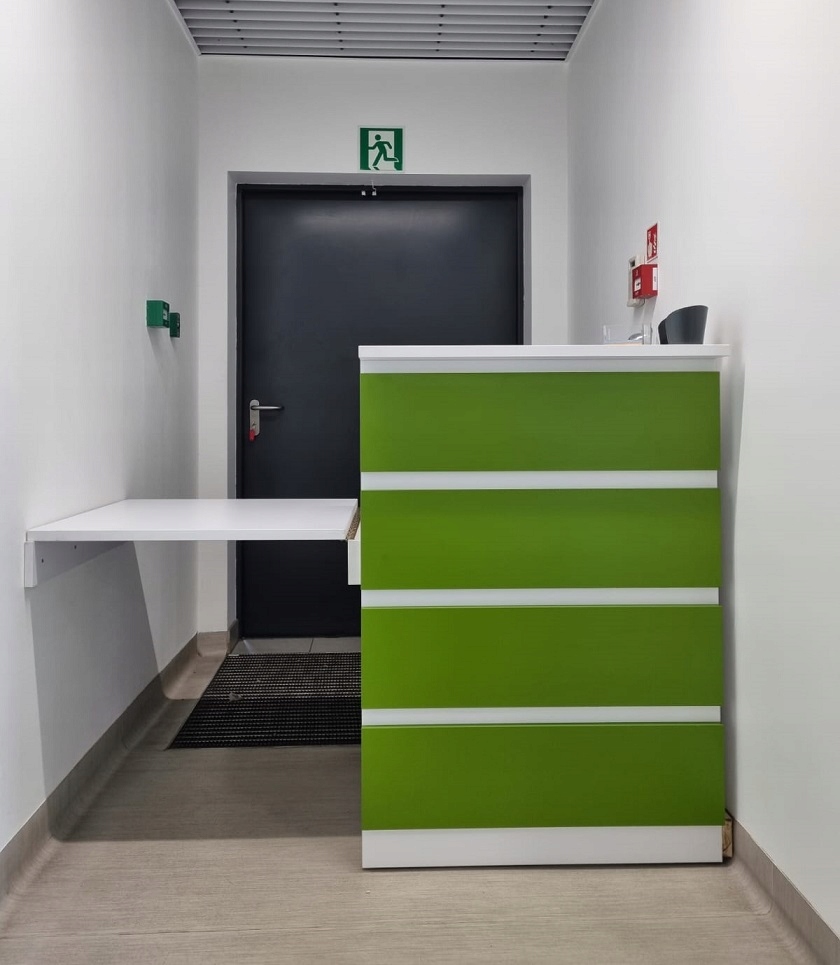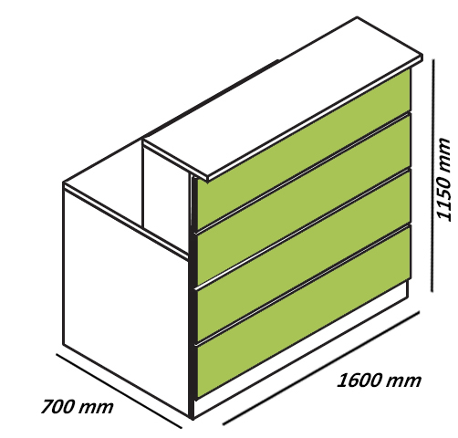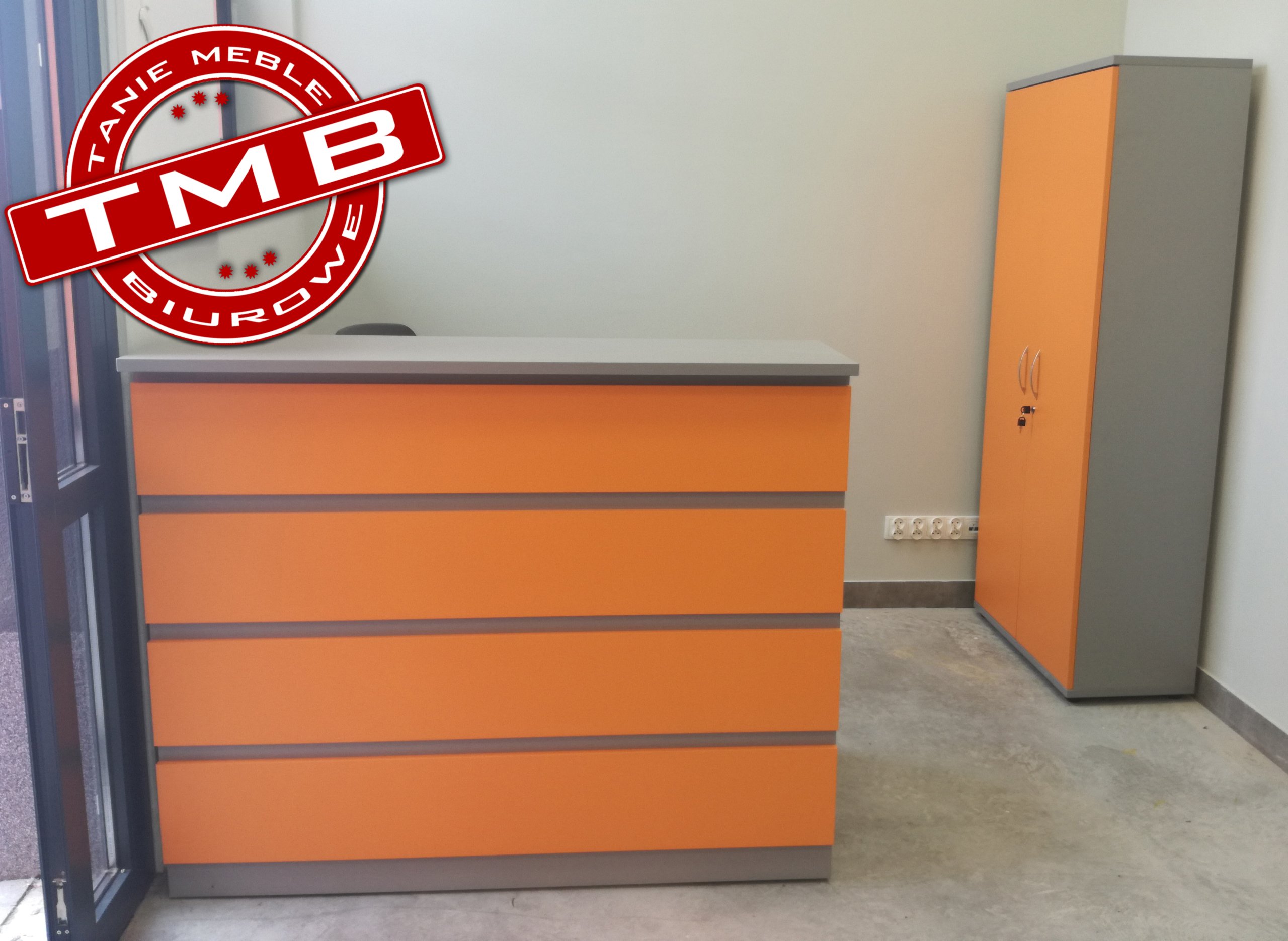 Дуже гарна пряма стійка зі стільницею довжиною 160 см, оригінальна, виготовлена з меблевої дошки відмінної якості. Стільниця і надставка виготовлені з дошки товщиною 25 мм. Стійка має регульовані ніжки, які дозволяють вирівняти меблі на нерівній підлозі. Стільниця глибиною 700 мм. Надставка глибиною 300 мм і висотою 400 мм, що дозволяє розмістити швидкозшивачі. Лічильник має дві кабельні втулки. Прямі лічильники з цієї системи є на інших аукціонах: низьких і високих. Прилавки доступні в багатьох кольорах, які також можна комбінувати, таким чином створюючи унікальні композиції. Є можливість придбати стільницю із загартованого скла товщиною 8 мм на алюмінієвих ніжках висотою 50 мм. Система офісних та рецепційних стійок складається з дуже великої кількості меблевих модулів, завдяки яким можна швидко спроектувати розстановку меблів у приміщеннях з маленькою або великою офісною площею.