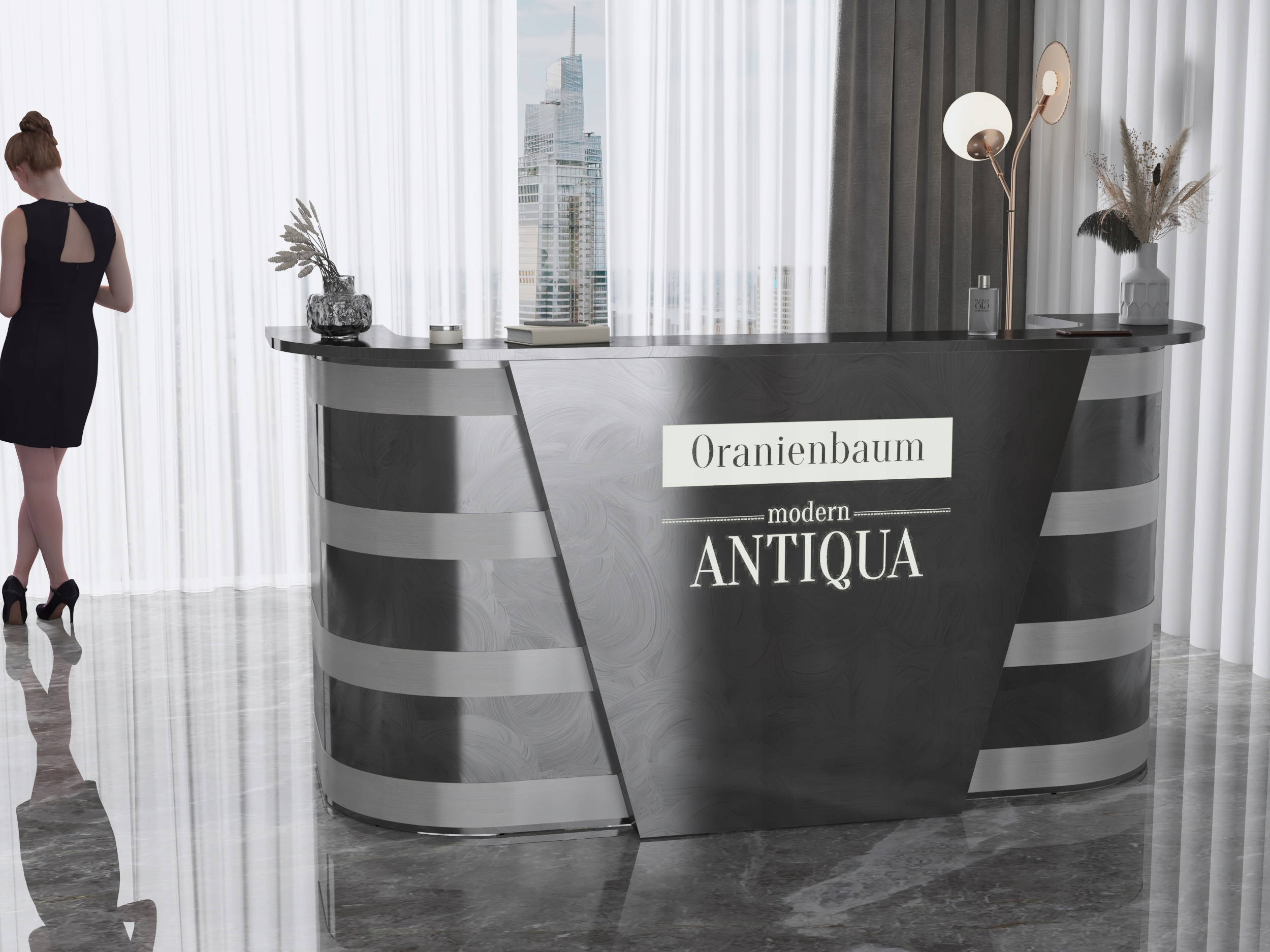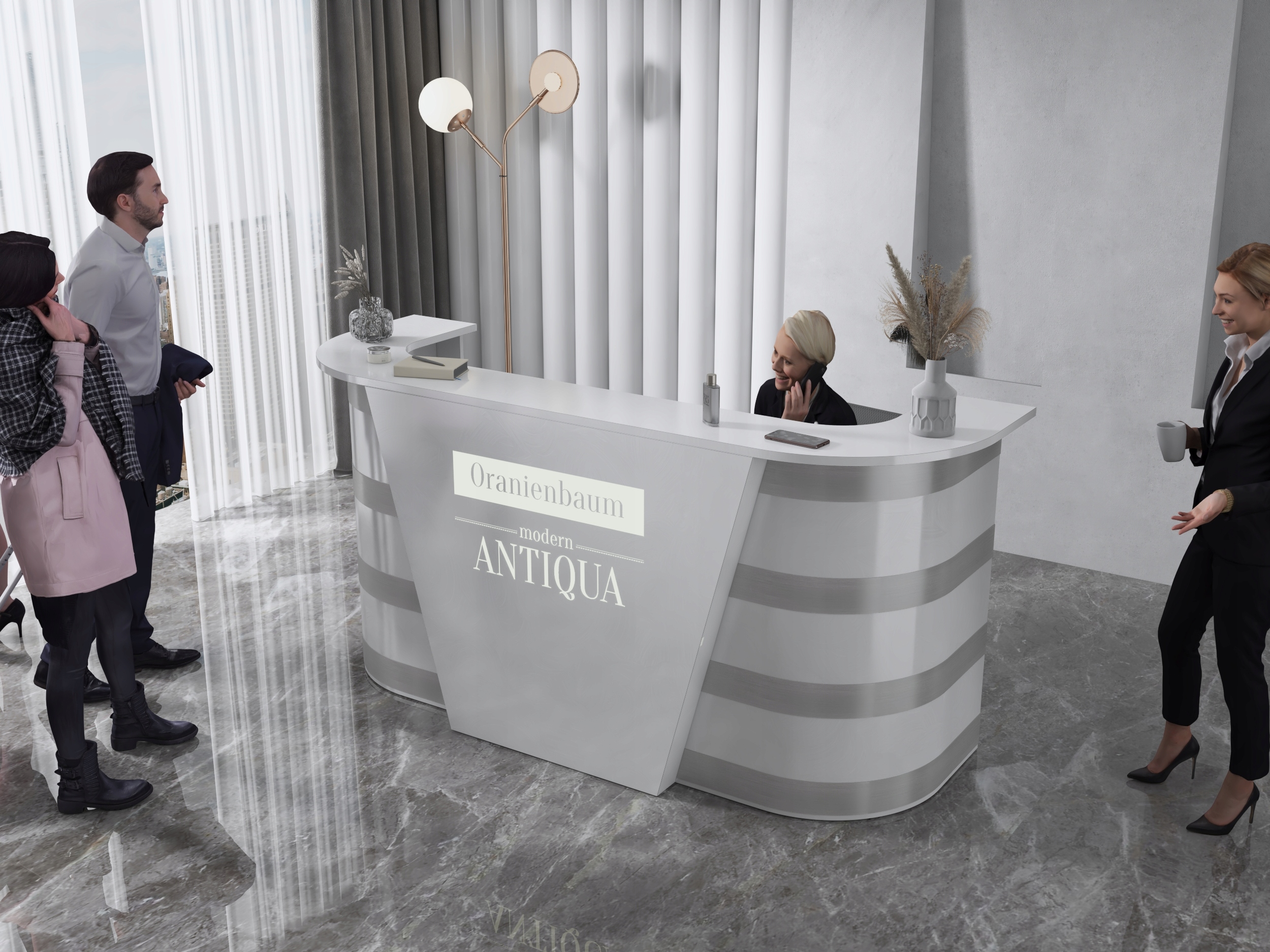 Сучасна рецепція характеризується модним дизайном, можливістю підлаштовуватися під розміри поверхні та актуальними кольорами – це особливості рецепції R211. Фасадну стійку з ламінату можна виконати в будь-якому бажаному кольорі, підкресливши напівкруглі кути. Лицьовий вигин дозволить вам розмістити свій логотип, завдяки чому ви будете впізнавані і запам'ятовуватимуться потенційним клієнтам надовго.