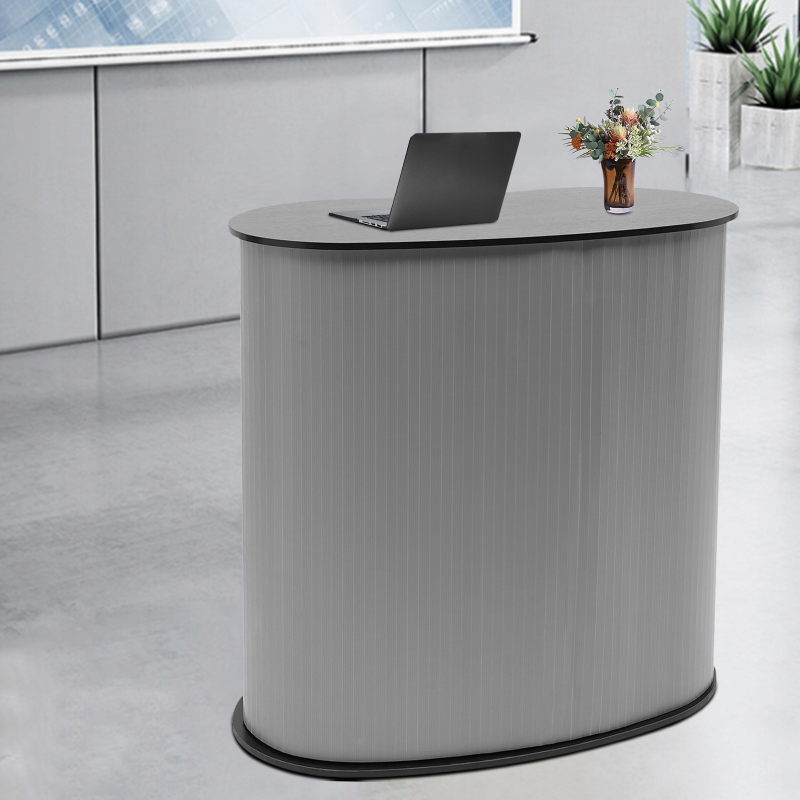 Елегантний вигляд: цей сучасний прилавок із обтічним дизайном і високоякісною кольоровою гамою надасть вашій події чи виставці професійний вигляд.