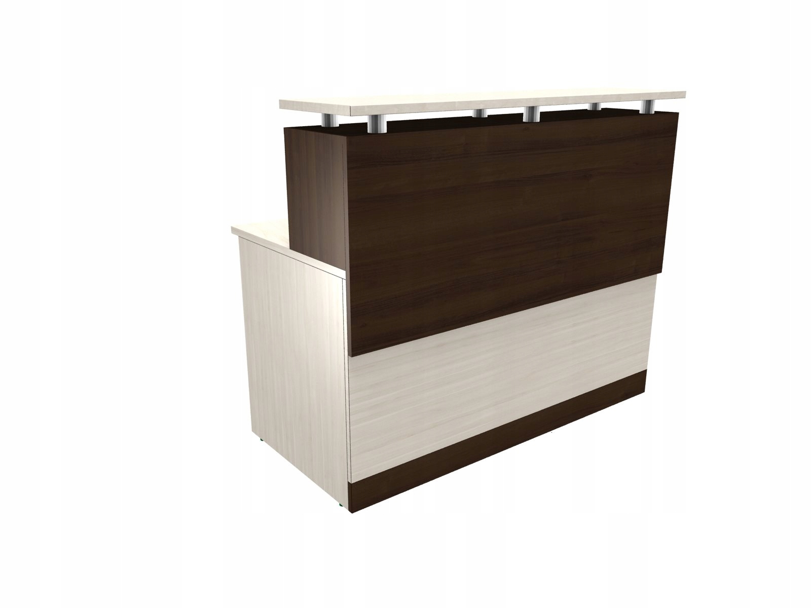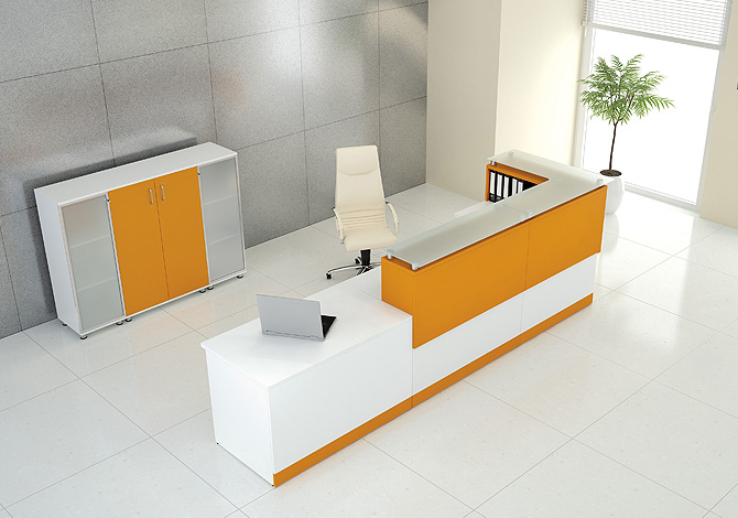 Дуже гарна стійка з подовжувачем 120 см, виготовлена з меблевої дошки відмінної якості. Стільниця, ніжки і надставка виготовлені з дошки товщиною 25 мм. Стійка має регульовані ніжки, які дозволяють вирівняти меблі на нерівній підлозі. Верх надбудови виготовлений з дошки, встановленої на ніжки висотою 50 мм. Стільниця глибиною 700 мм. Подовжувач глибиною 320 мм і висотою 358 мм. Лічильник має дві кабельні втулки. На інших аукціонах є дорожчий прилавок зі скляною стільницею та прямі прилавки цієї системи: низькі та високі. Прилавки доступні в багатьох кольорах, які також можна комбінувати, таким чином створюючи унікальні композиції. Система офісних та рецепційних стійок складається з дуже великої кількості меблевих модулів, завдяки яким можна швидко спроектувати розстановку меблів у приміщеннях з маленькою або великою офісною площею.