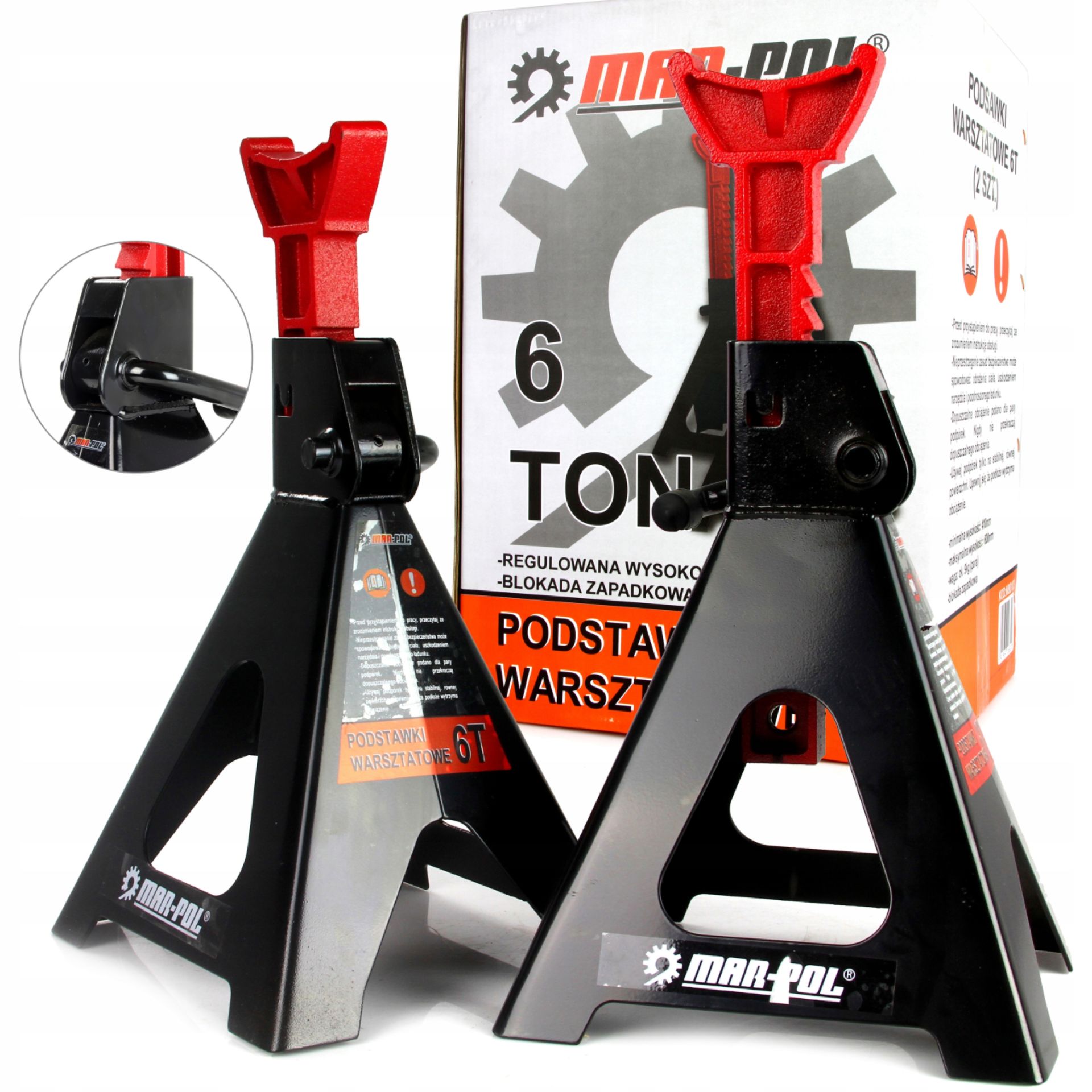 Стійки забезпечують безпечну та стабільну підтримку автомобіля на спеціально профільованих сідлах. Фіксуючий важіль ефективно фіксує опорні стовпи у вибраному положенні. Вони виготовлені з міцної сталі та мають міцну зварну конструкцію. Ніжки підставок мають приварені широкі ніжки, які стабілізують опори під час роботи під навантаженням.