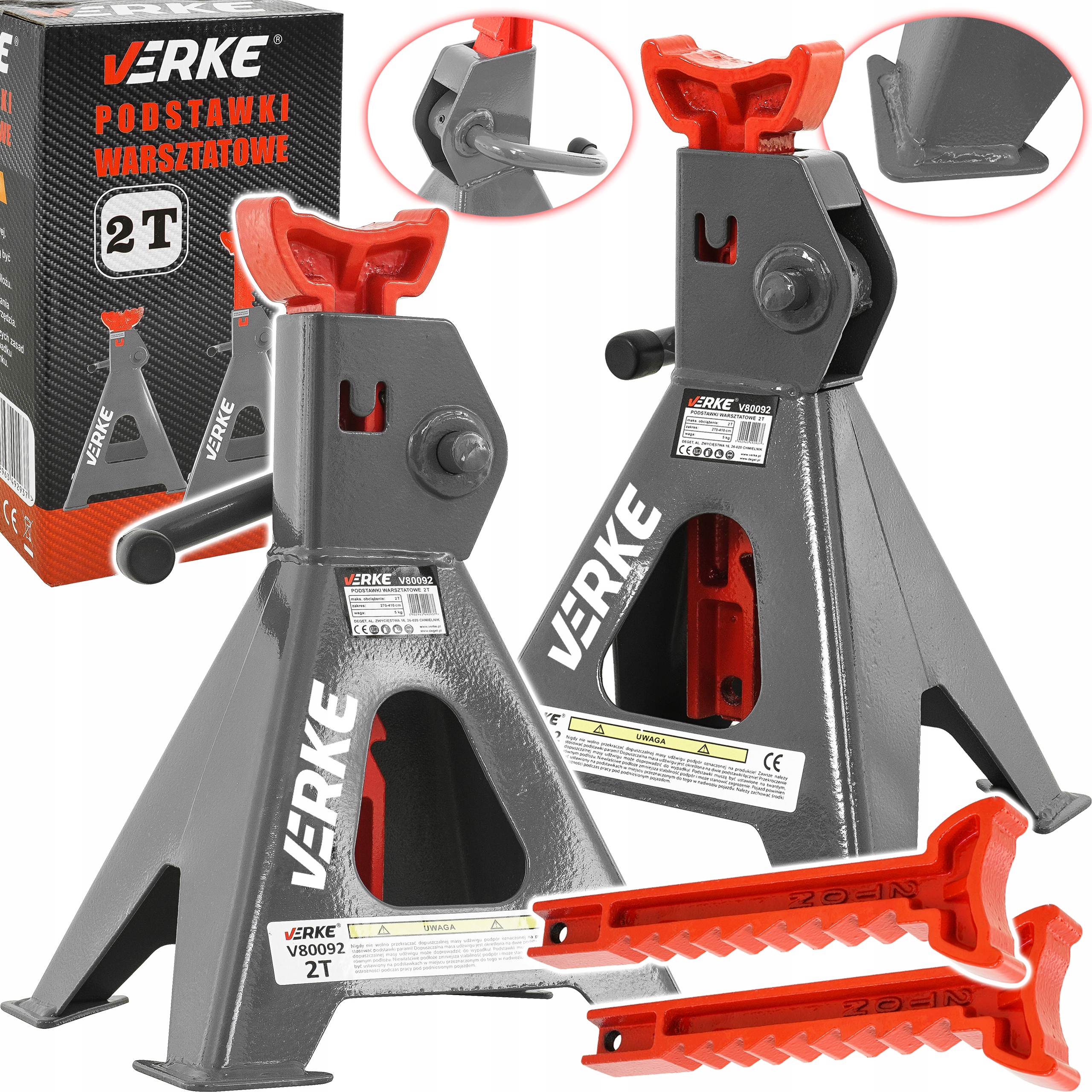 Професійні 2Т автомобільні стенди від Verke. Стійки виготовлені з товстих сталевих профілів і мають простий у використанні фіксатор висоти. Додатковою перевагою цих підставок є ніжка з широкою лапкою, завдяки чому підставки не вриваються в землю під тиском опорного предмета. Це захищає основу від пошкоджень і підвищує стійкість опор. Їх міцна і міцна конструкція забезпечує ефективне і тривале використання. Особливо призначений для професійних автомобільних майстерень, але його також можна використовувати в домашніх гаражах. Ідеальні інструменти для механіків і всіх автомобілістів.