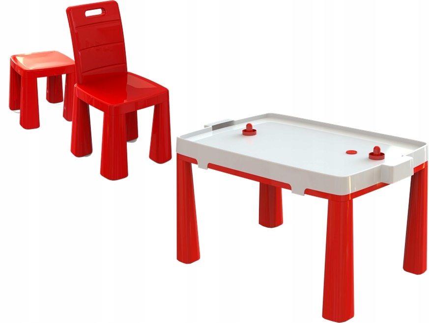 Практичний набір дитячих меблів, який легко трансформується в набір для аерохокею завдяки накладці на стільницю. Крім того, стілець функціонує як табурет, просто сфотографуйте спинку. Набір виготовлений з високоякісного матеріалу.