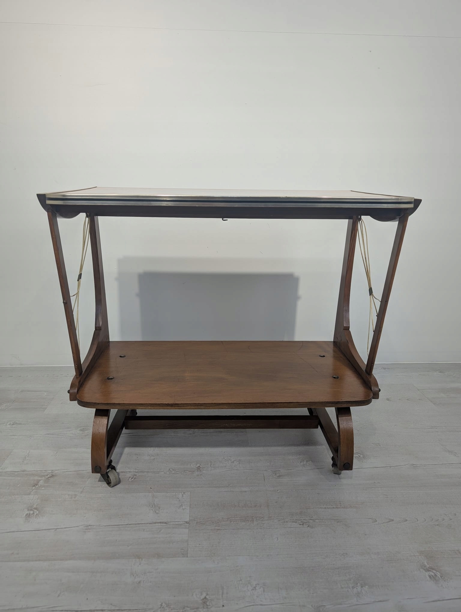 Стильний журнальний столик у стилі ар-деко, барна стійка 1950-х/60-х років. 20 століття. Штанга має дві полиці та колеса для зручності переміщення. Ідеально підходить для вітальні або їдальні.