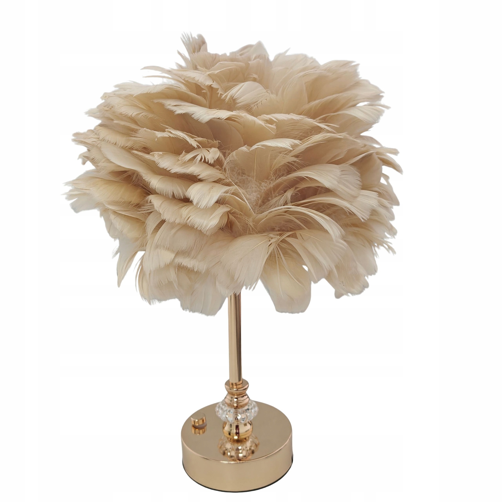стильна лампа, виготовлена з бежевих пір'я , - це прикраса, яка приносить теплоту, делікатність та елегантність інтер'єру. Лампшад, виготовлений з м'яких пухнасті пір’я в тонкому відтінку бежевого прекрасного відволікання світла, створюючи приємну затишну атмосферу. Ціле вбудоване на золоту, блискучу основу з кришталевими деталями , а джерело живлення акумулятора або через USB -кабель (включений, без щиколотки) забезпечує комфорт та рухливість.