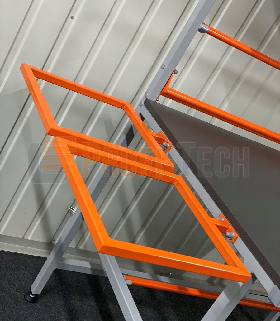 Столи та підставки виготовлені зі сталевих профілів, які були довго захищені порошковим покриттям, краї профілі заповнені дюбелями ПВХ.