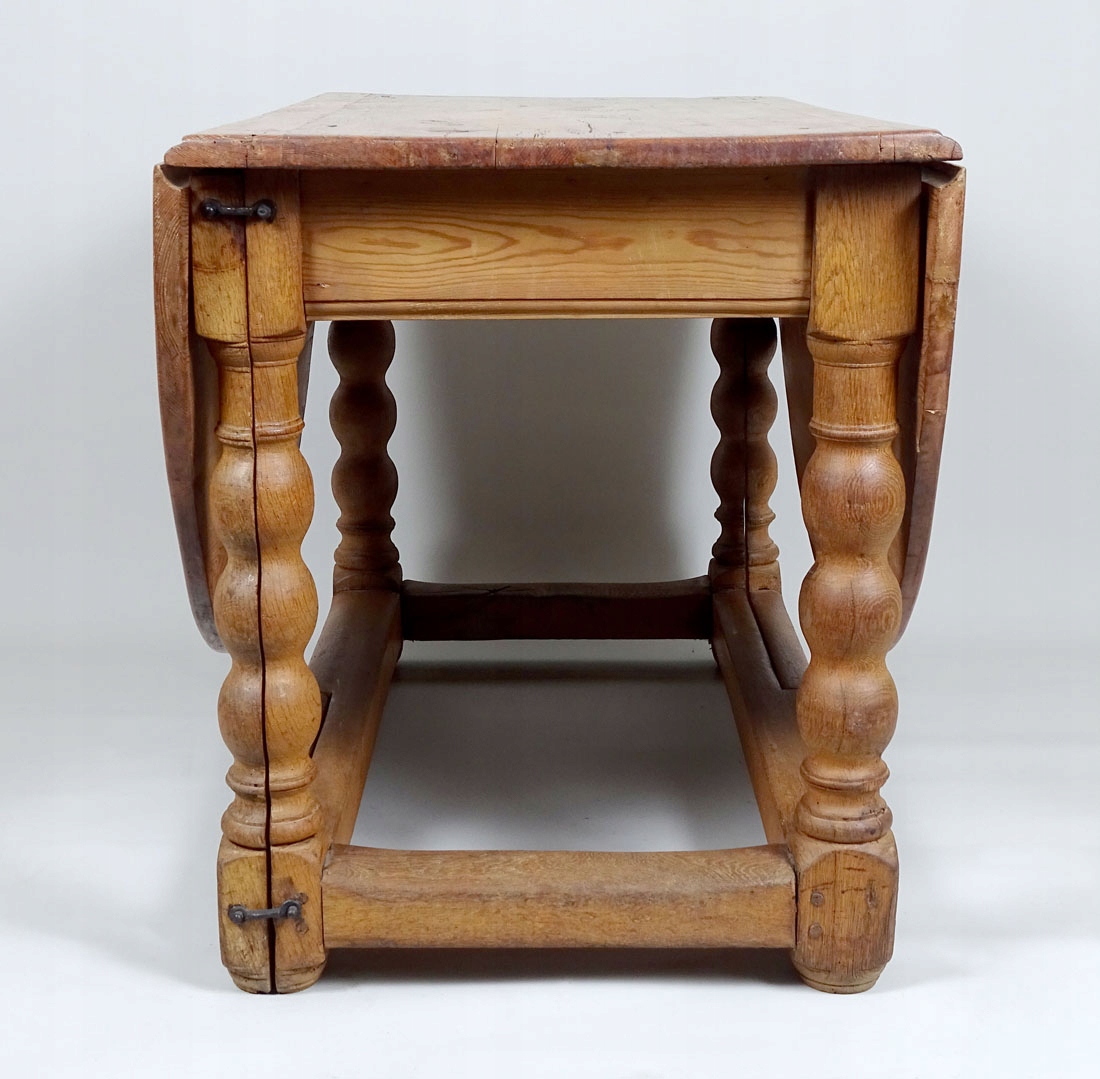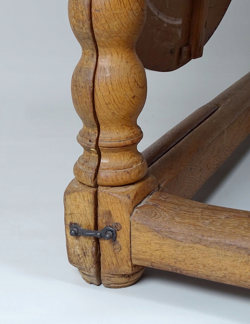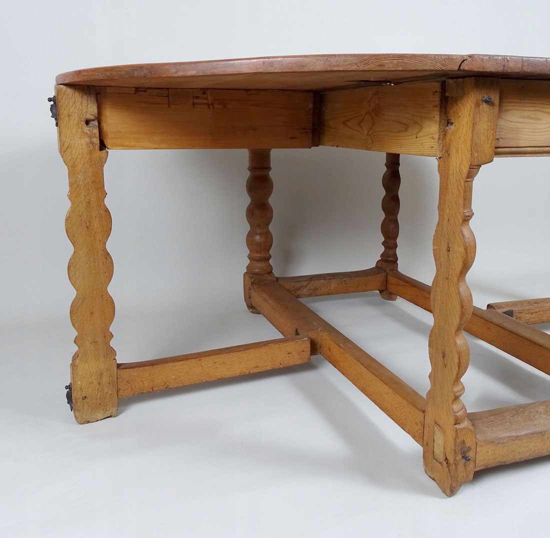 з основною прямокутною стільницею та двома додатковими. Допоміжні стільниці у формі півкола кріпляться до рами за допомогою сталевих петель, а також спираються на висувні елементи з двох ніжок, що робить весь стіл виключно стійким. Все тримається на чотирьох точених, масивних ніжках, з’єднаних внизу суцільним стрижнем.