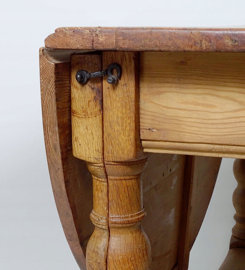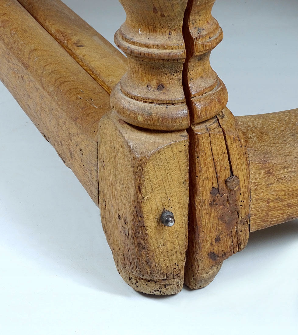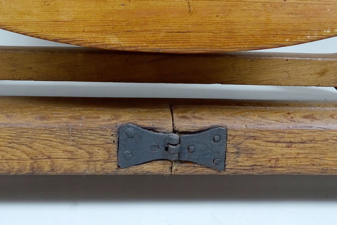з основною прямокутною стільницею та двома додатковими. Допоміжні стільниці у формі півкола кріпляться до рами за допомогою сталевих петель, а також спираються на висувні елементи з двох ніжок, що робить весь стіл виключно стійким. Все тримається на чотирьох точених, масивних ніжках, з’єднаних внизу суцільним стрижнем.
