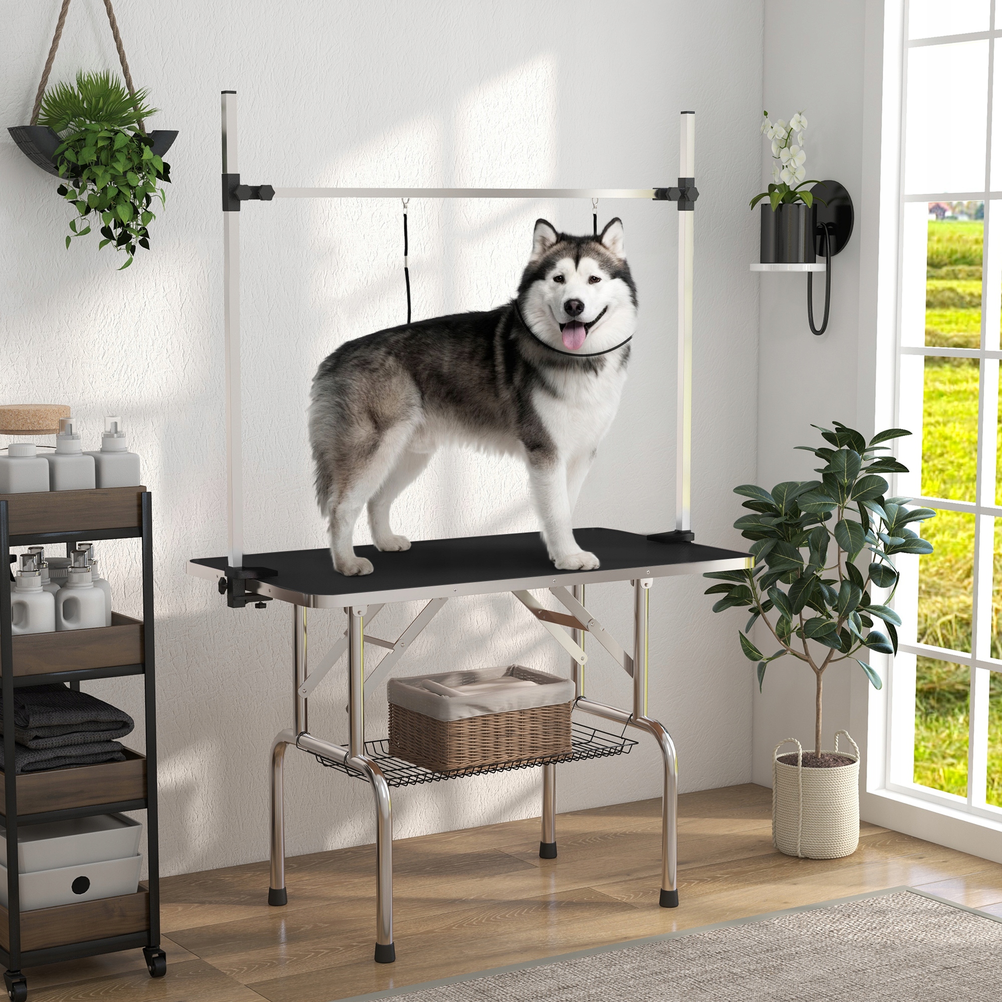 Стіл для стрижки собак, регульований, з кошиком, чорний