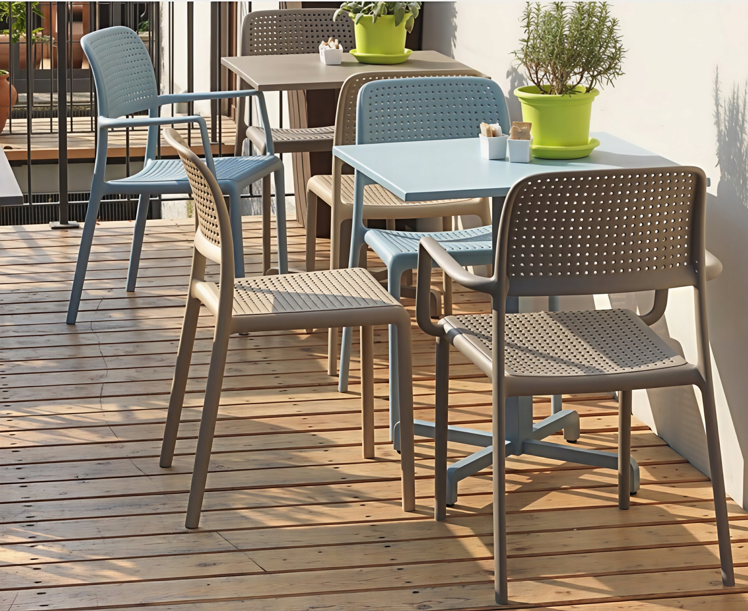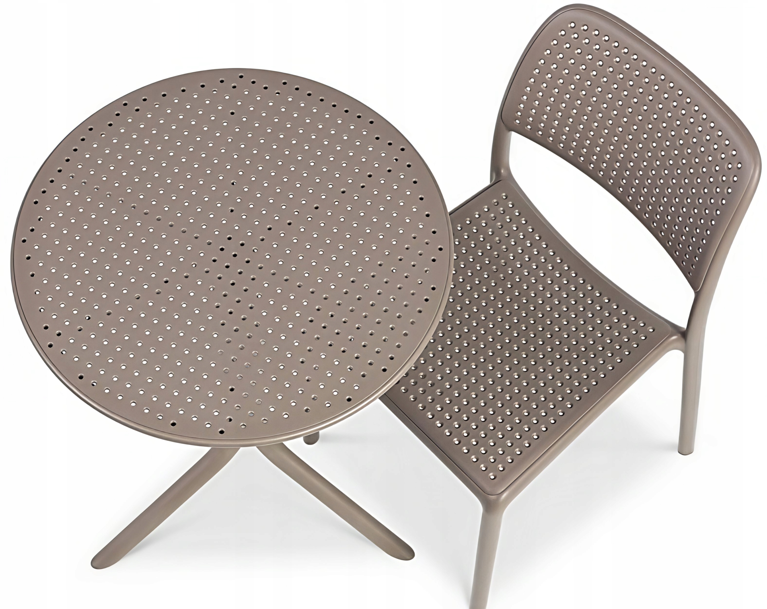 Компактний набір ідеально підходить для кафе, ресторанів, терас, балконів та в домашніх садах. Таблиця 80x80x75 см з відкритою роботою підходить до менших просторів, забезпечуючи комфорт для 4 людей.