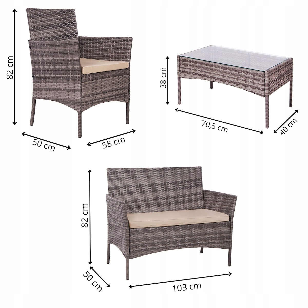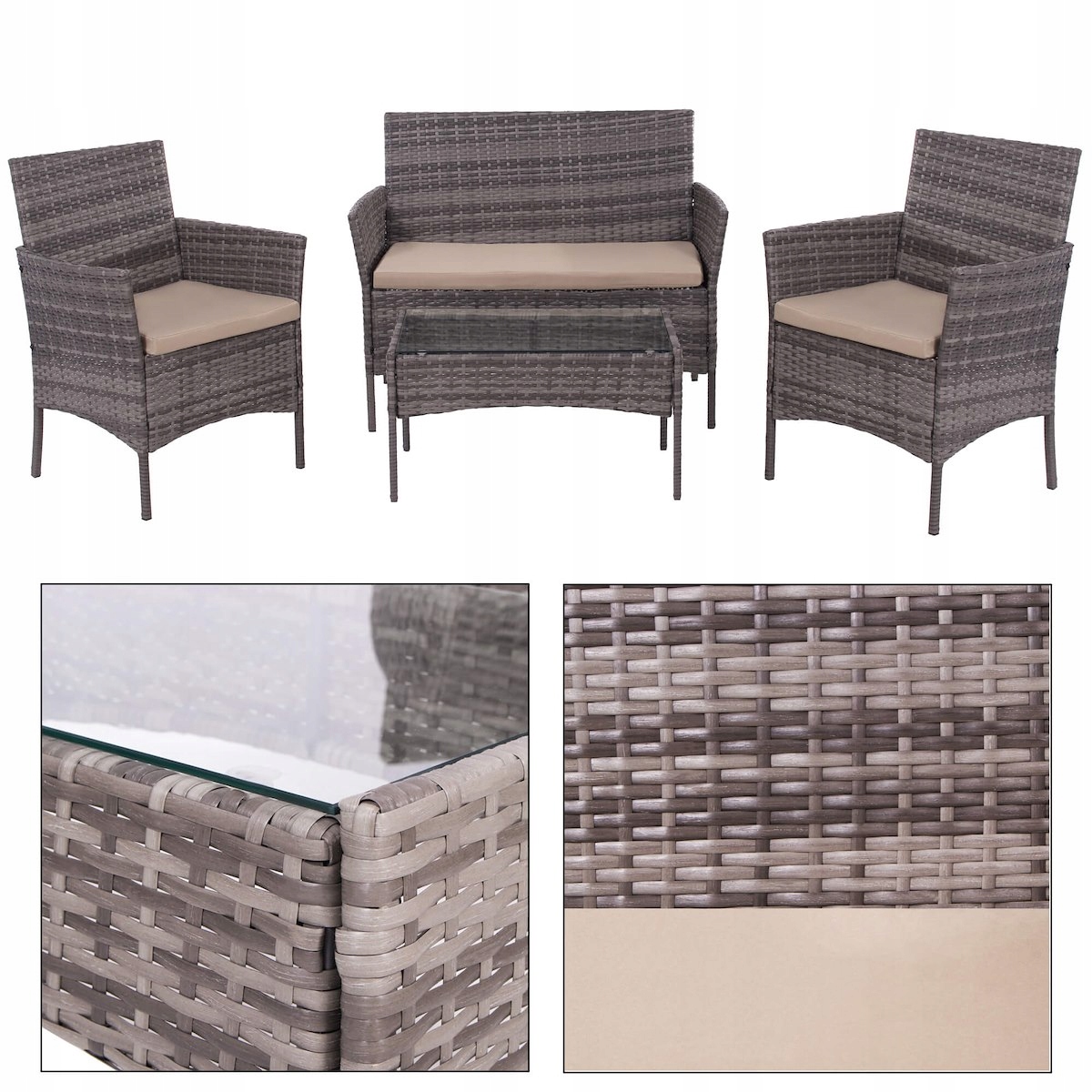 - Матеріал: техноротанг, загартований скло, поліестер/пінопропіленовий ПП