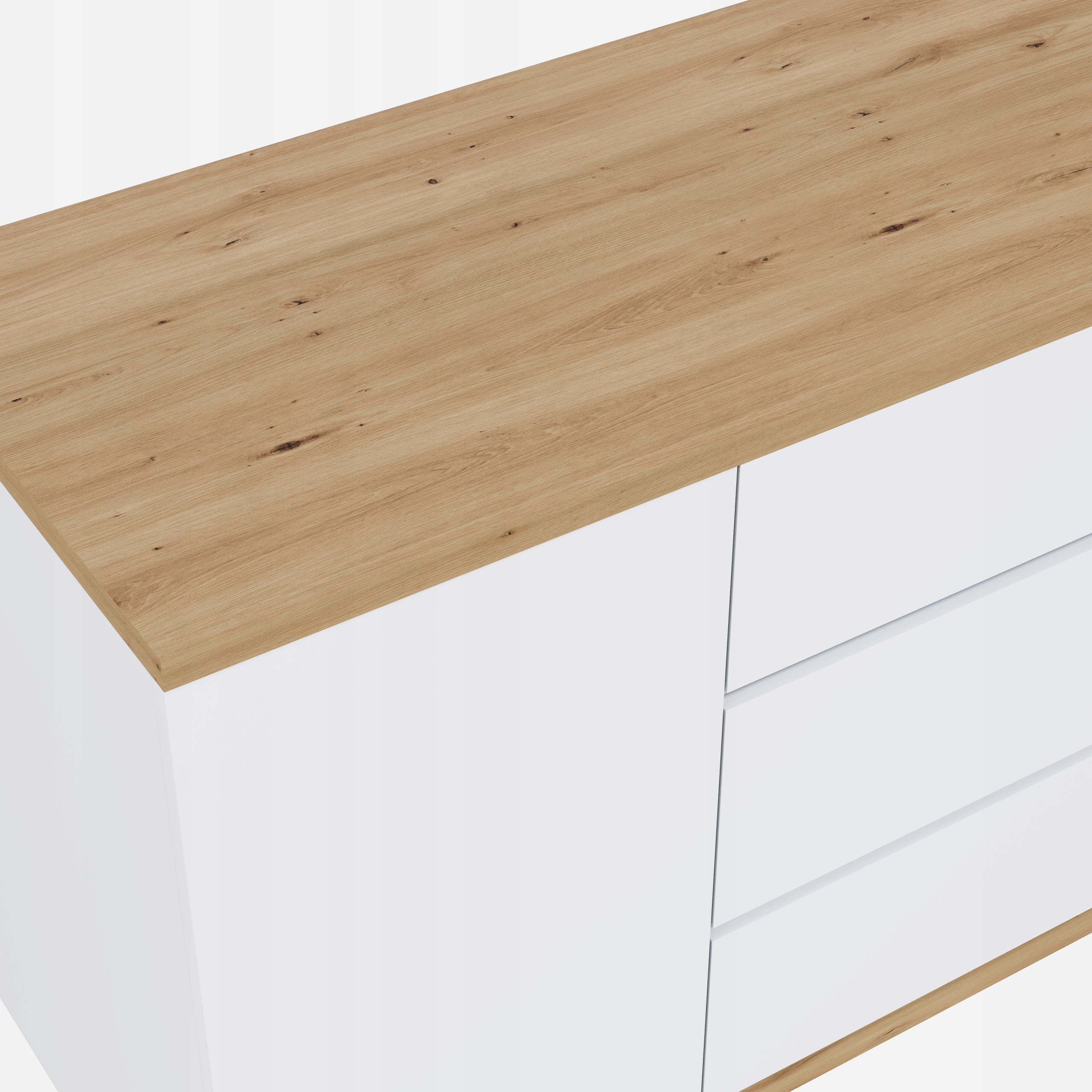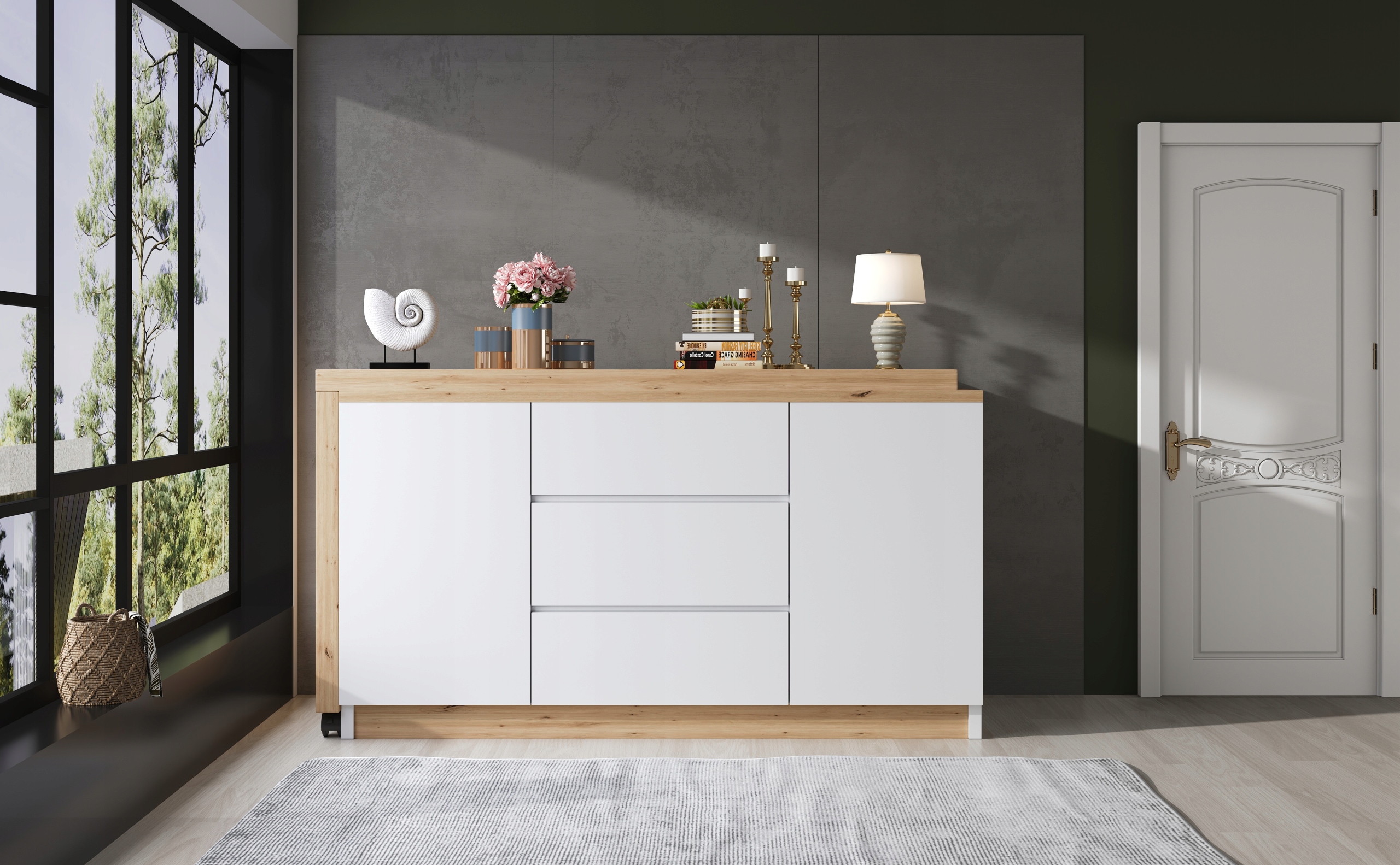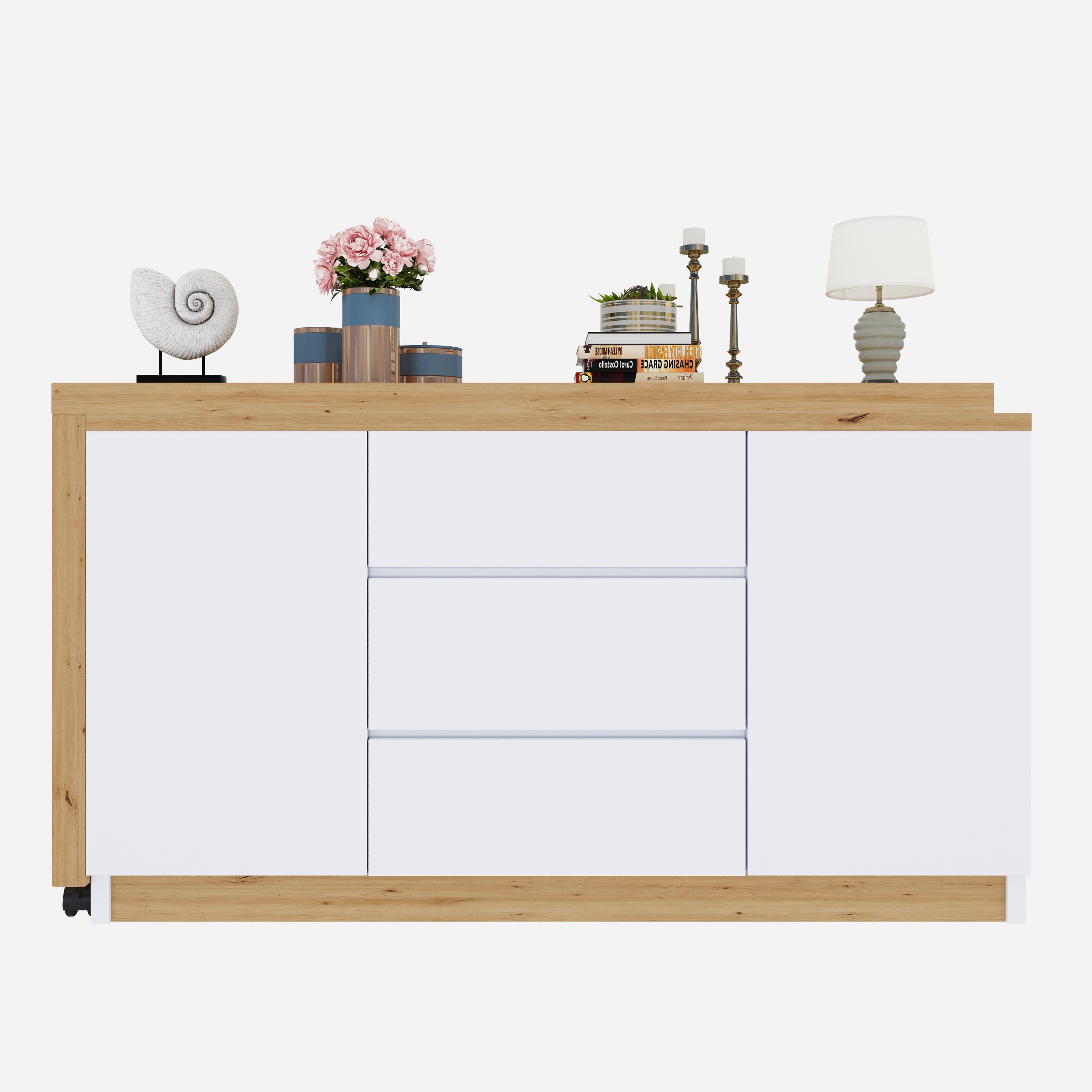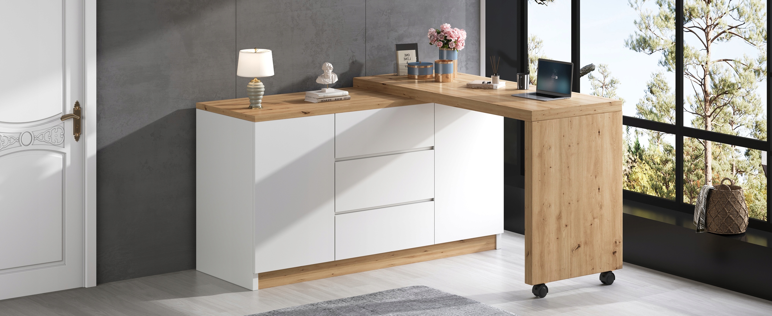 Цей стіл з колесами розміром 120 × 50 × 76,5 см поєднує функціональність, простір для зберігання та сучасний дизайн. Виготовлений з сертифікованої стрічки, він пропонує міцне та екологічне рішення для домашнього офісу, вітальні чи спальні. Обертова верхівка дозволяє універсальне використання: після складання він створює компактний сервант і при розгортанні - просторий стіл - прямий, у формі букви L або кута. Завдяки двом дверима та трьома ящикам, він пропонує багато місця для документів, офісних приладдя чи особистих предметів.