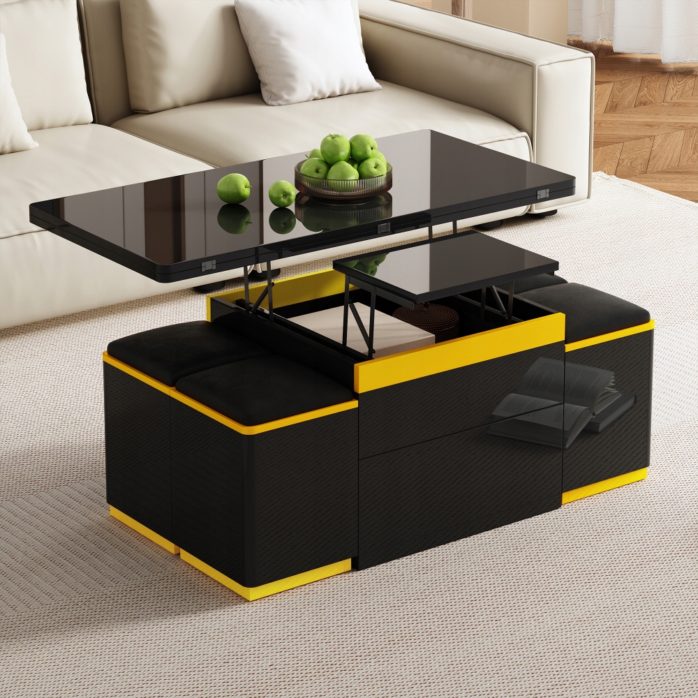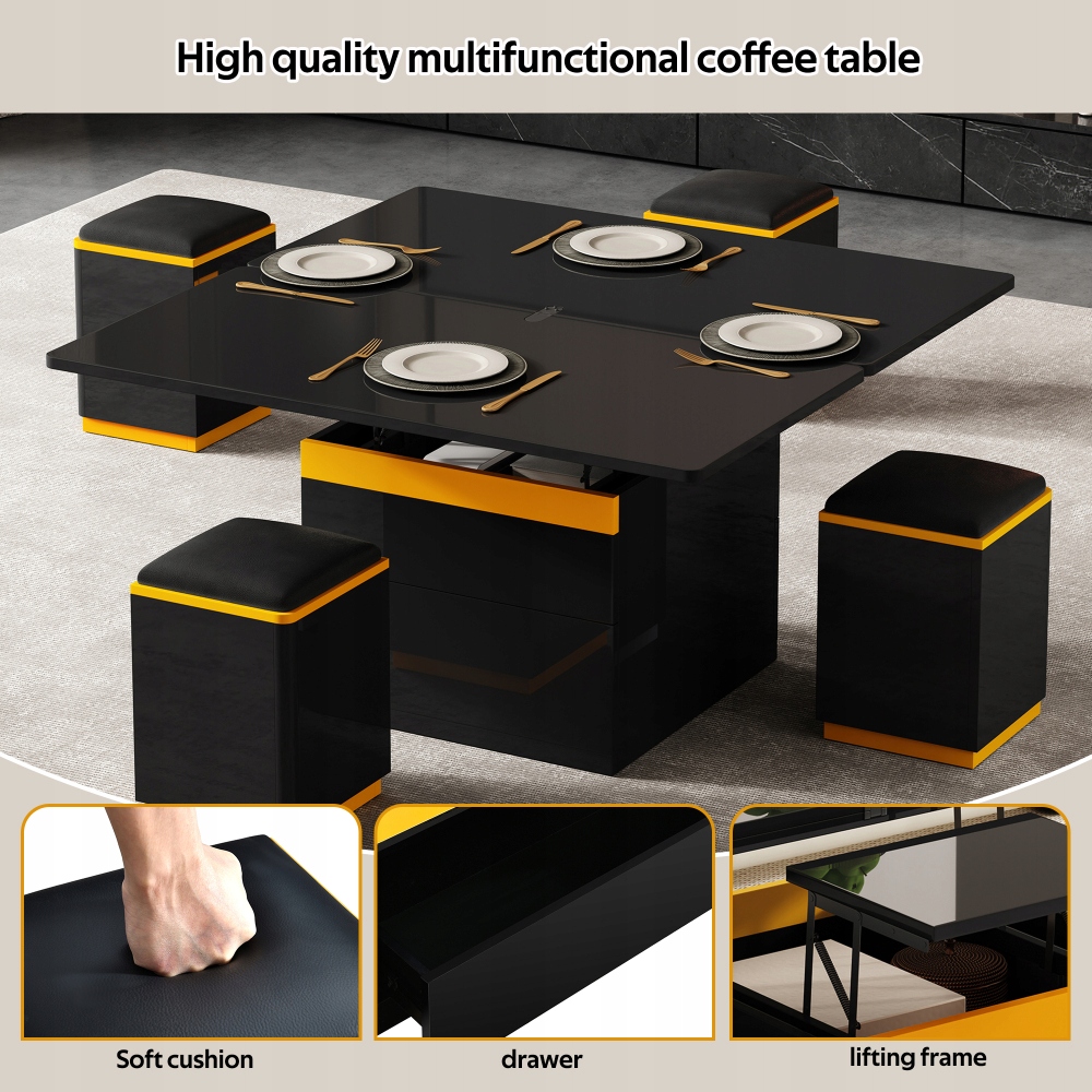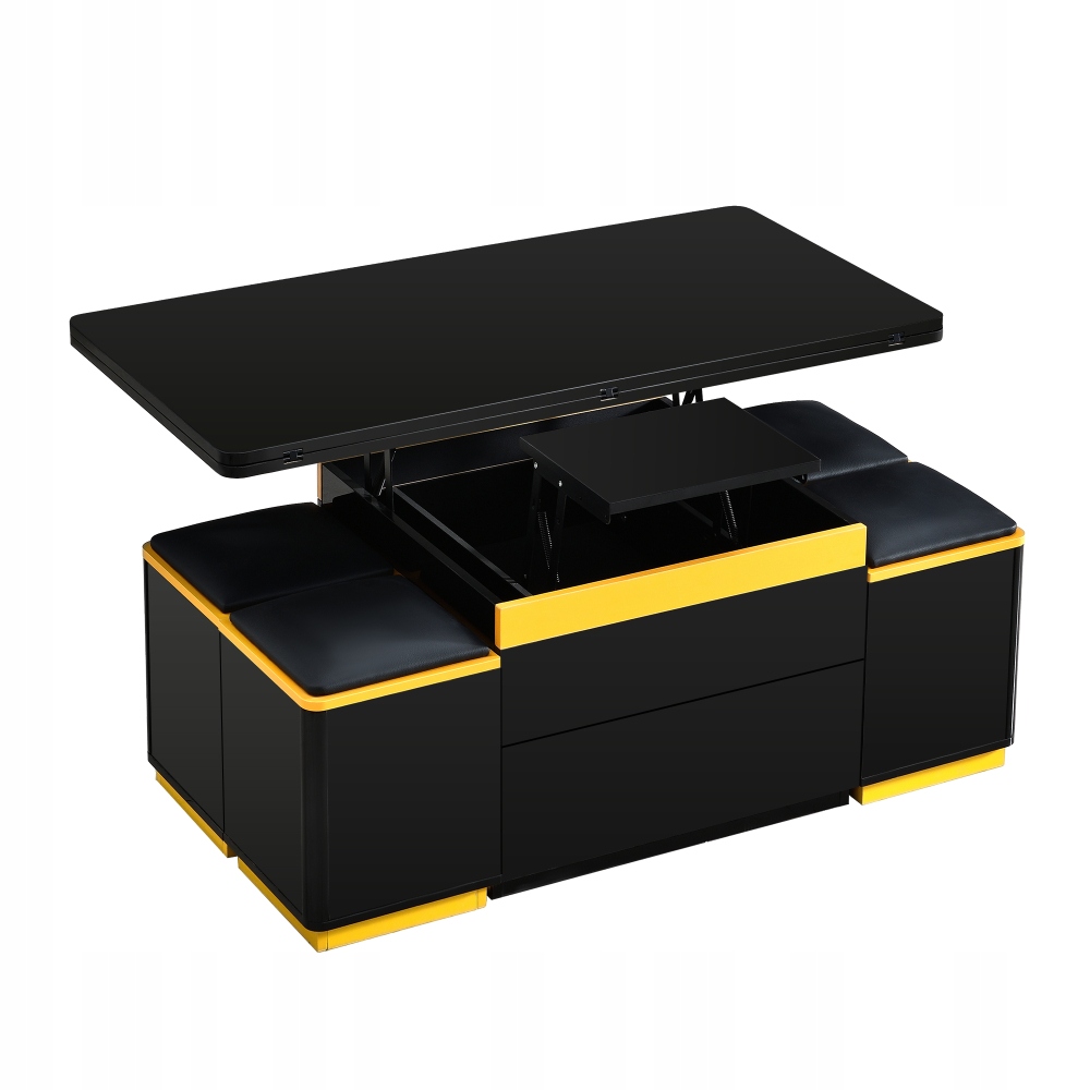 Цей багатофункціональний журнальний столик з регульованою висотою поєднує в собі гнучке використання простору з практичністю: його висота регулюється, а в складеному стані він швидко перетворюється з журнального столика в обідній або письмовий стіл — ідеально підходить для невеликих квартир. Вбудовані шафи мають ящики і відкриті полиці. У поєднанні з чотирма відповідними стільцями з відсіком для зберігання речей створюється система, яка поєднує в собі функції журнального столика, сидіння та місця для зберігання, оптимізуючи використання простору. Чіткі, чорно-жовті лінії ідеально вписуються в сучасний стиль життя і гармоніюють з різними стилями інтер'єру, включаючи мінімалізм і індустріальну естетику. Завдяки компактній конструкції журнальний столик не потребує додаткових аксесуарів і розкладається, щоб вмістити багато людей. Це ідеальне рішення для маленьких віталень і квартир.