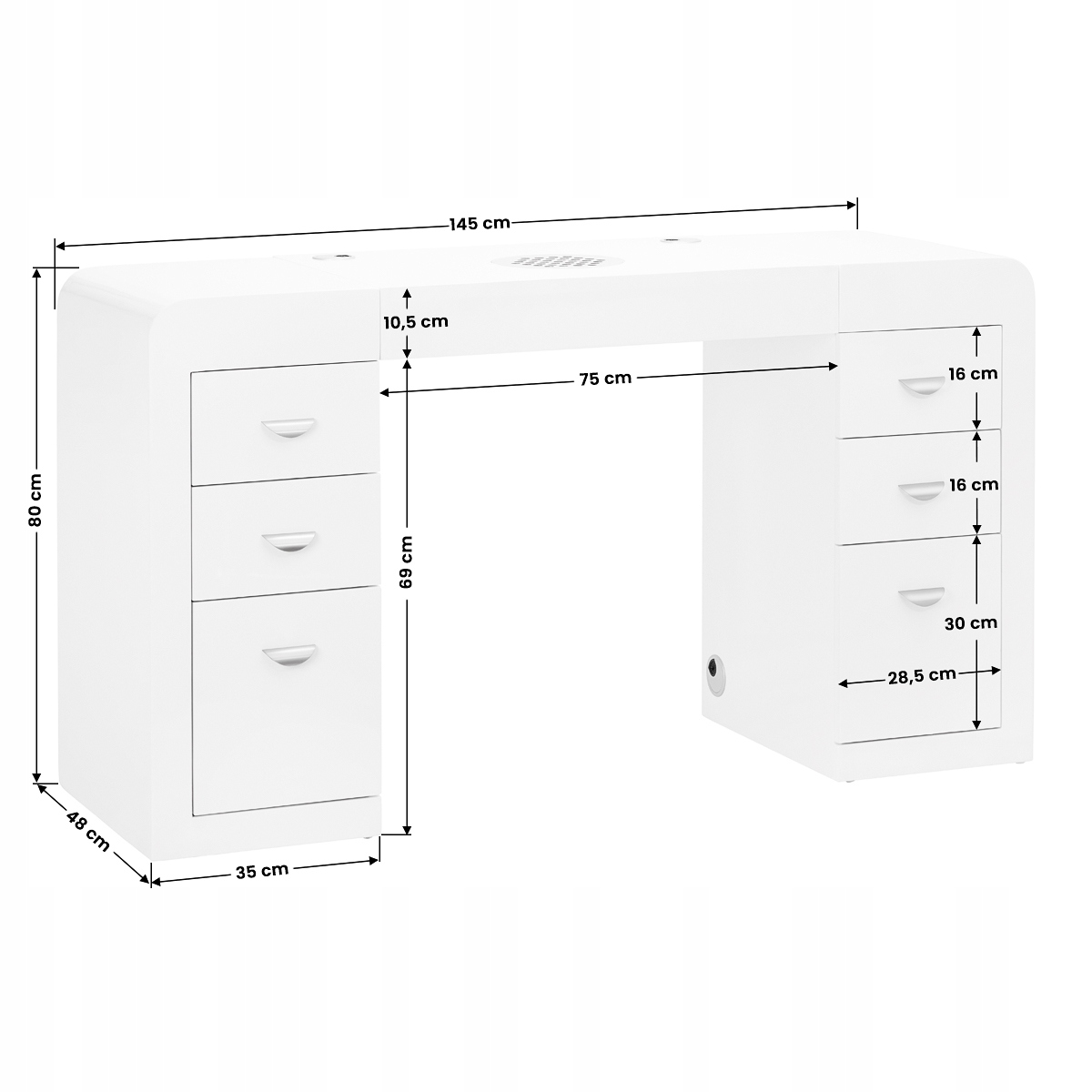 Шафи з обох боків із трьома місткими висувними ящиками значно полегшують організацію та утримання в порядку найнеобхіднішої косметики та інструментів. Завдяки цьому необхідні продукти завжди під рукою, а це означає ефективність роботи. Стіл має спеціальні отвори в стільниці для прокладання кабеліввід необхідних пристроїв, що дозволяє легко підтримувати порядок і естетичність робочого місця.