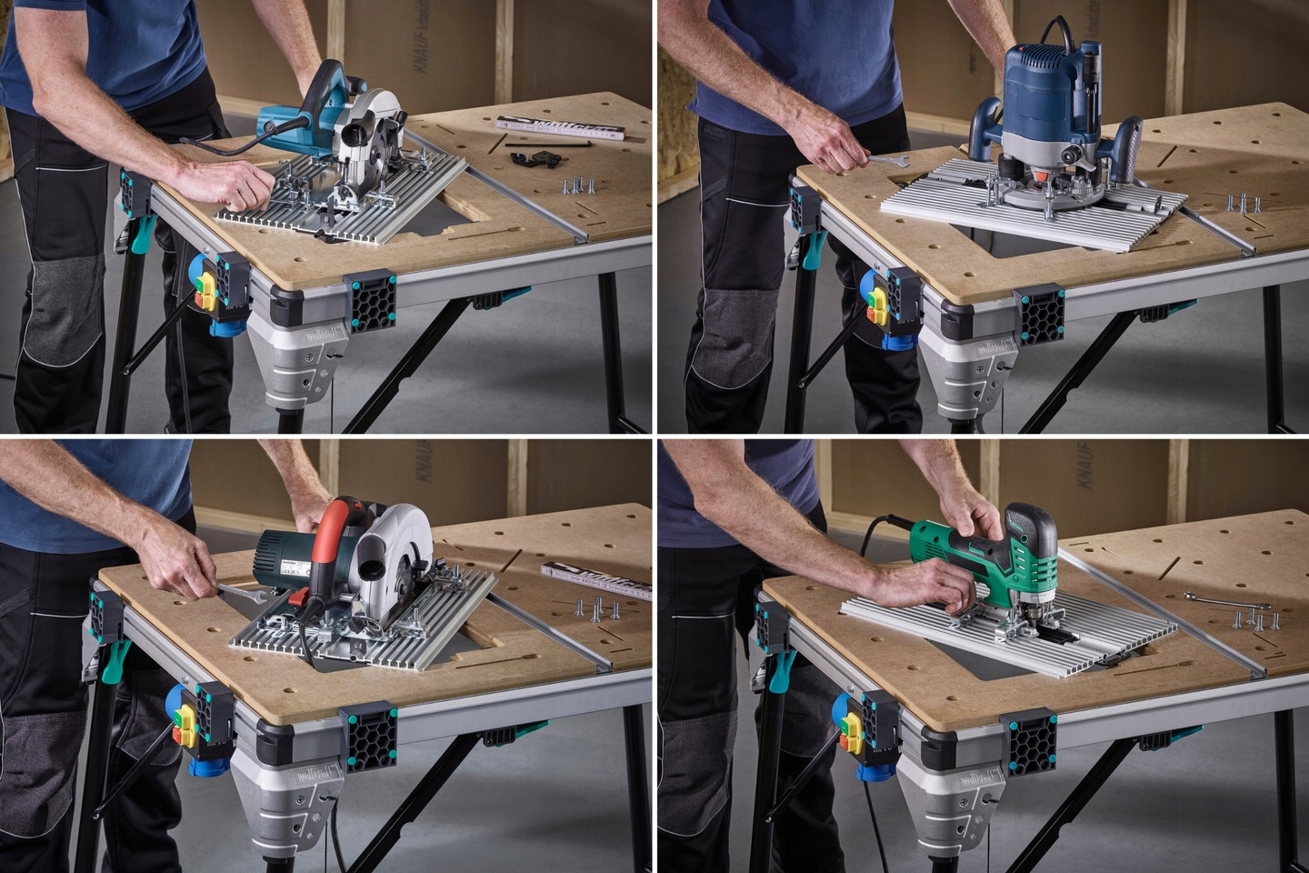 - Стіл можна використовувати як настільну пилу, стіл для лобзика, стіл для торцювальної пилки, верстакі - з додатковими аксесуарами - як фрезерний стіл і стіл для ручної циркулярної пилки.